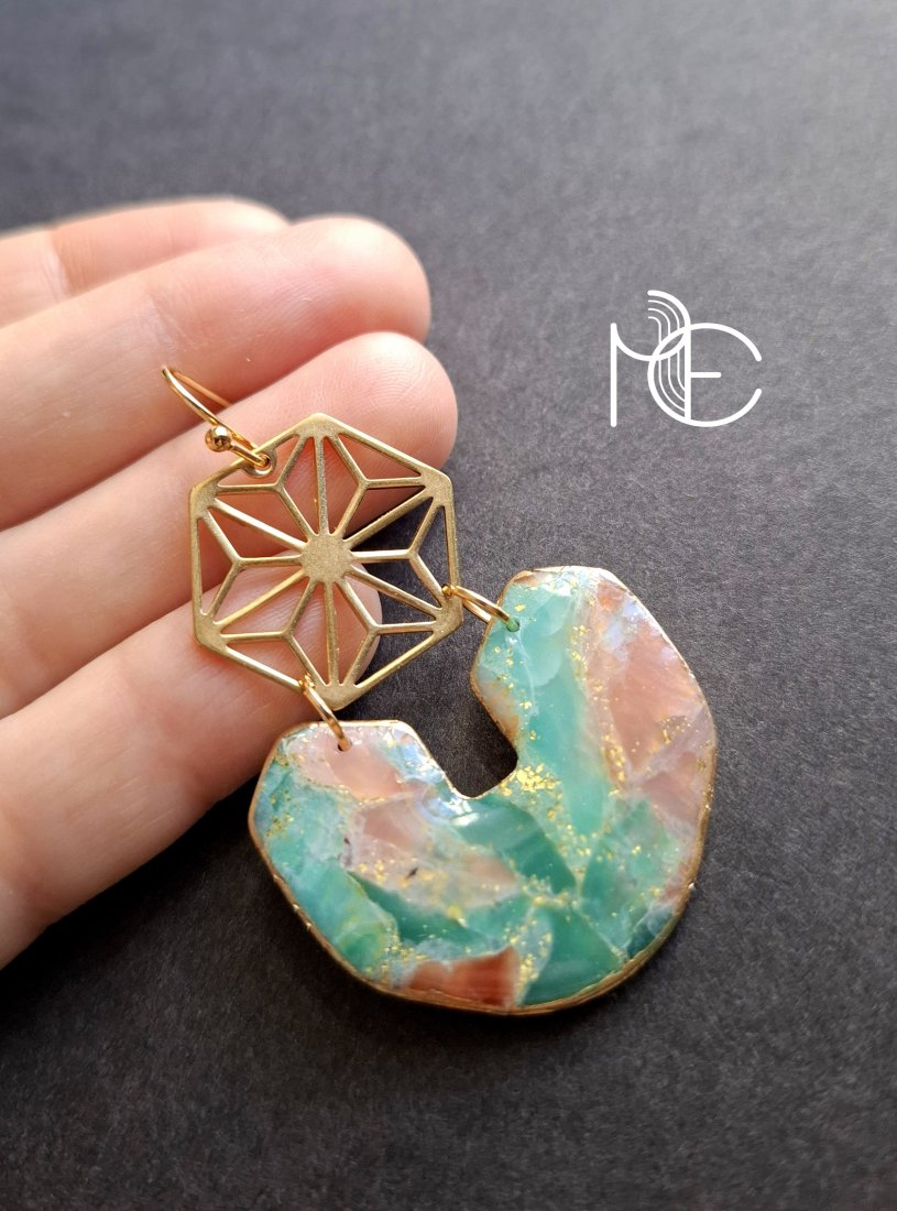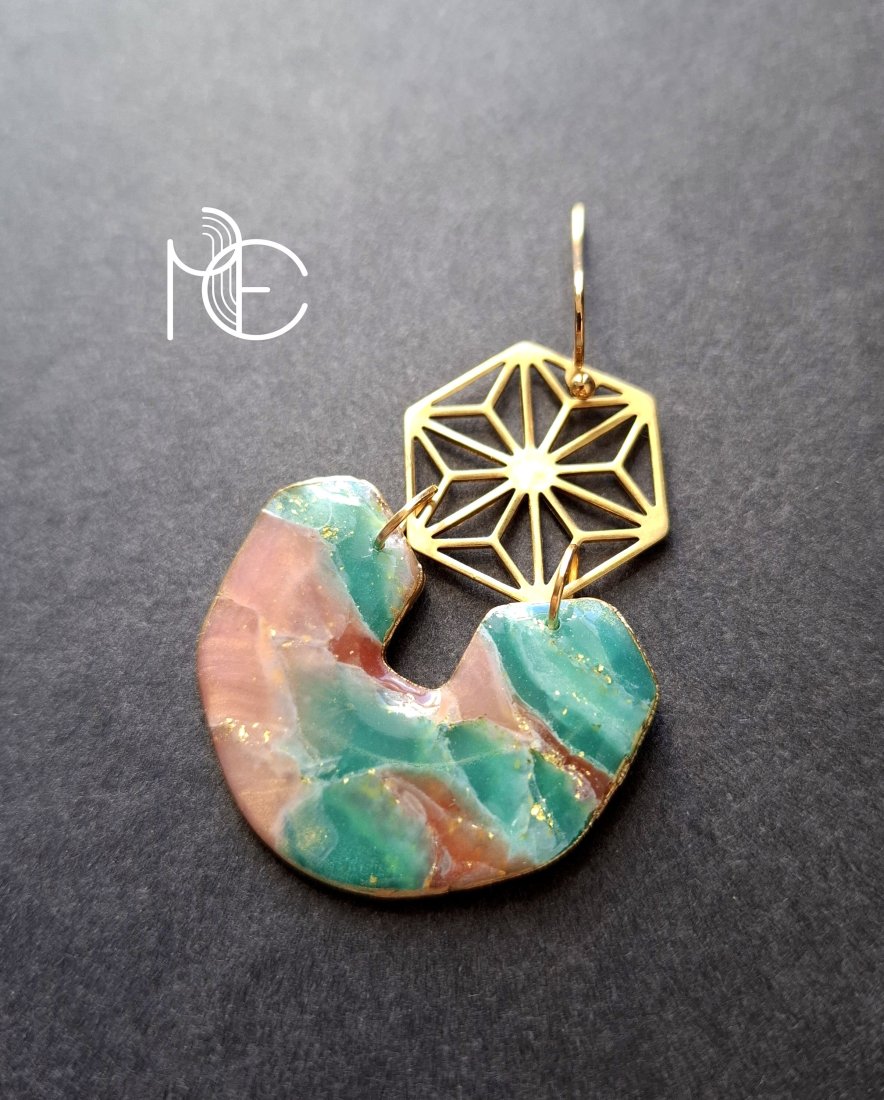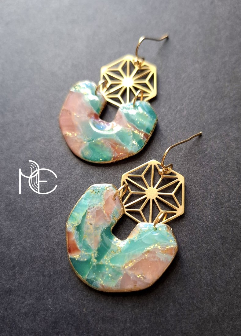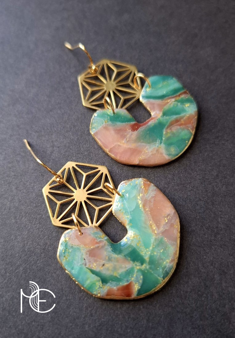 Kolczyki wiszące wykonane z wysokiej jakości glinki polimerowej z efektem półprzezroczystości i dodatkiem ozdobnych, ażurowych elementów z metalu. Jednostronne z prostymi, pozłacanymi i nieuczulającymi biglami. Wymiary: długość wraz z zapięciem: 6 x 3,4 cm. Wykonane w jedynym egzemplarzu.