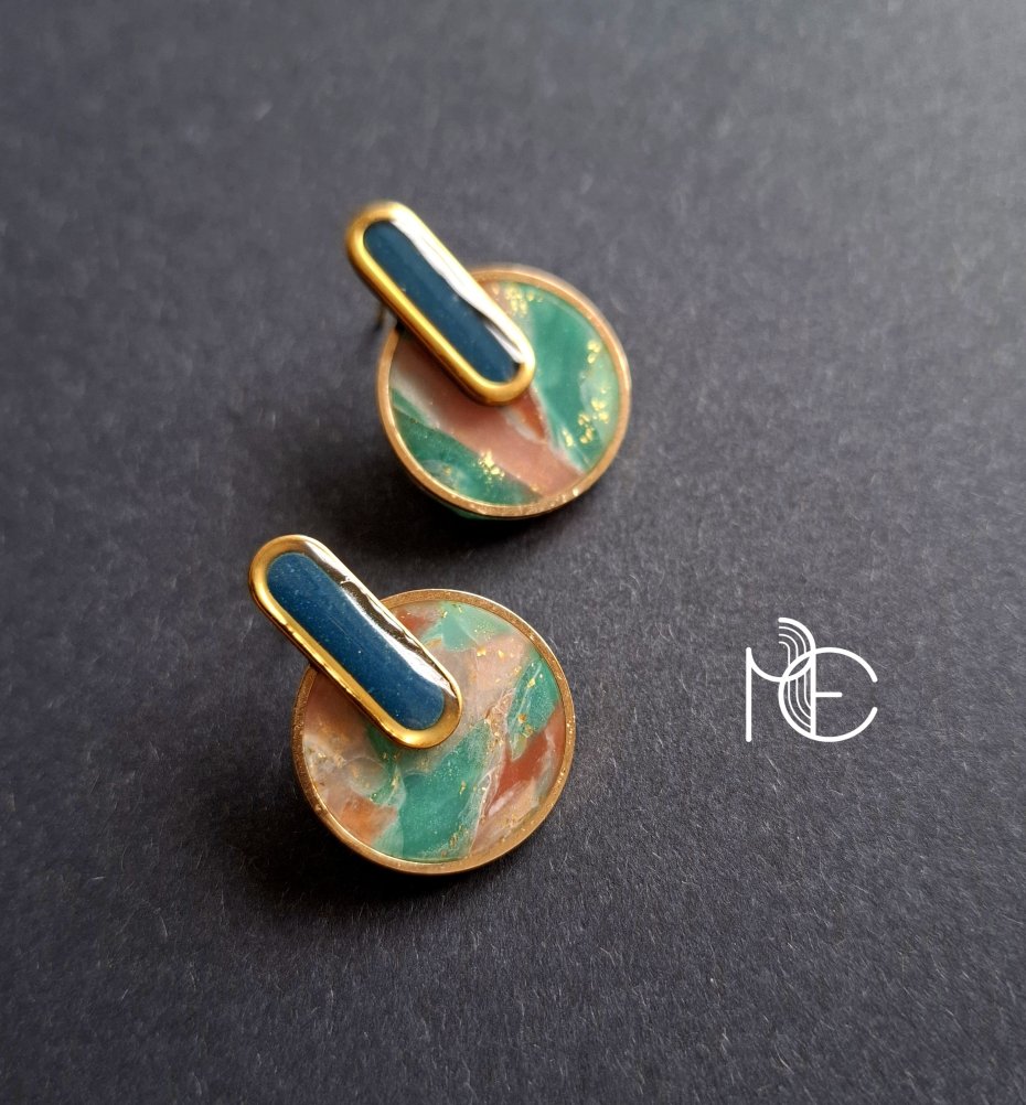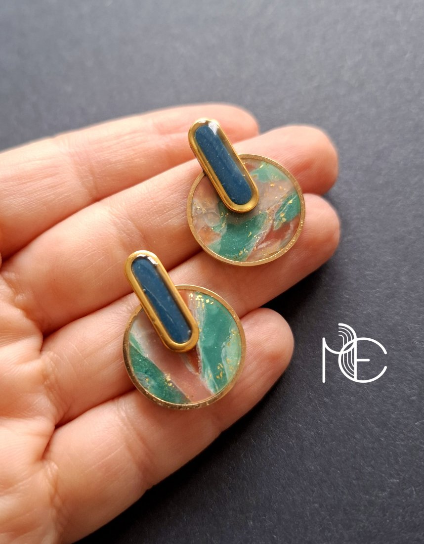 Kolczyki na sztyfty wykonane z wysokiej jakości glinki polimerowej z efektem półprzezroczystości i dodatkiem ozdobnych elementów metalowych. Jednostronne z pozłacanymi, nieuczulającymi sztyftami. Wymiary: 2,7 x 2 cm. Wykonane w jedynym egzemplarzu.