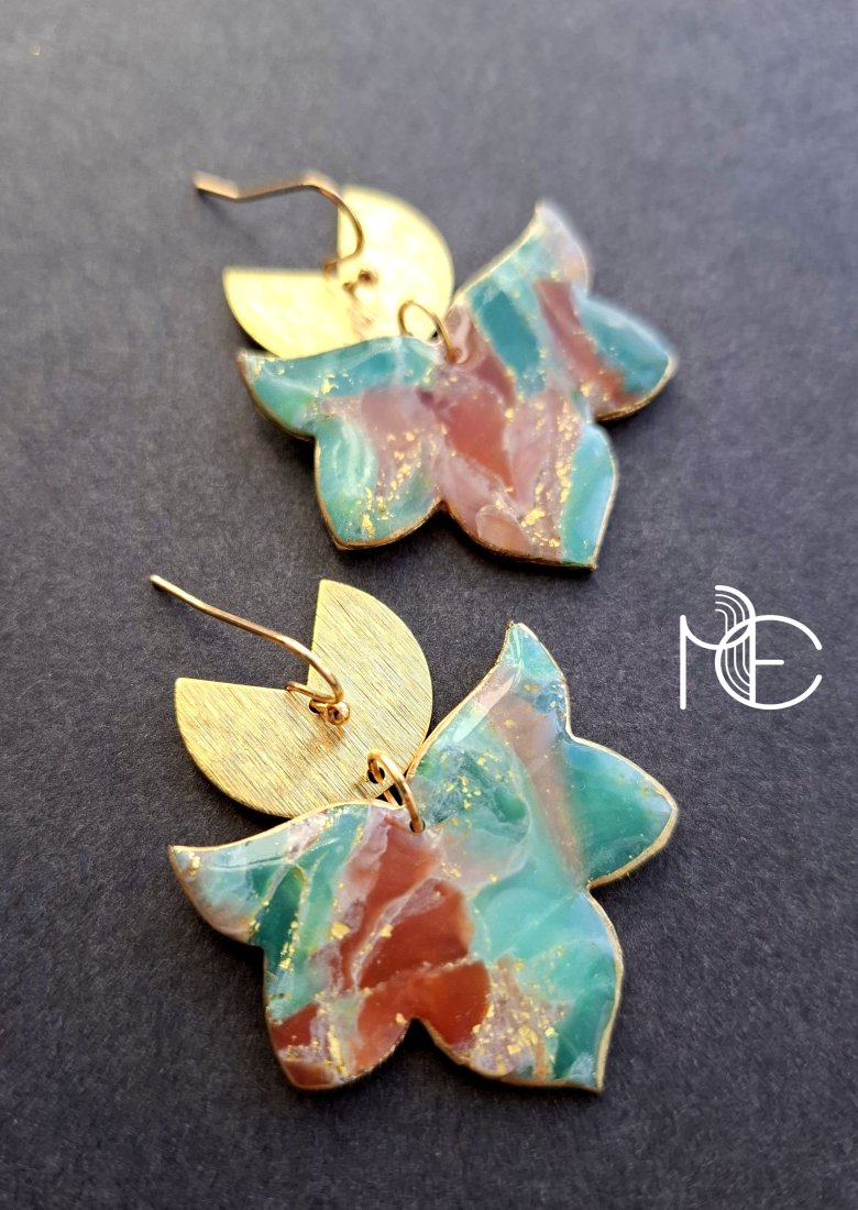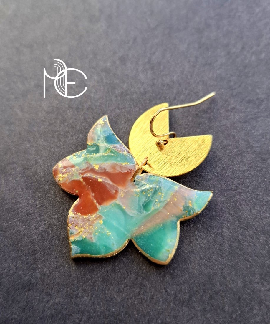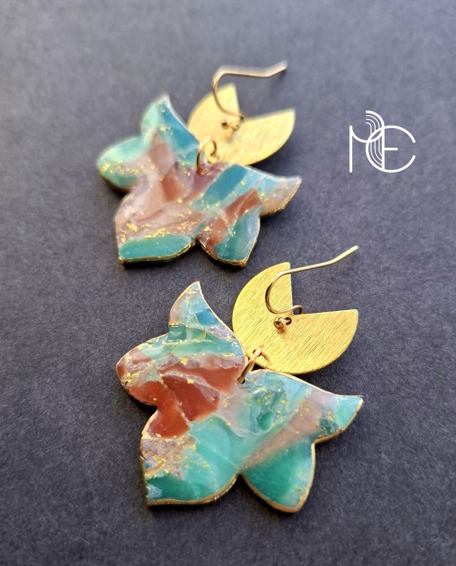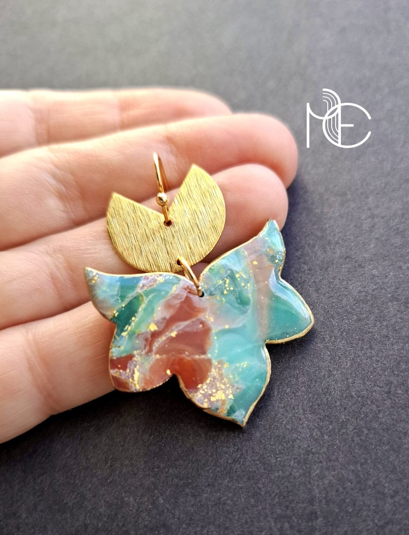 Kolczyki wiszące wykonane z wysokiej jakości glinki polimerowej z efektem półprzezroczystości i dodatkiem ozdobnych elementów metalowych. Jednostronne z prostymi, pozłacanymi i nieuczulającymi biglami. Wymiary: długość wraz z zapięciem: 4,7 cm; szerokość max. 3,4 cm.