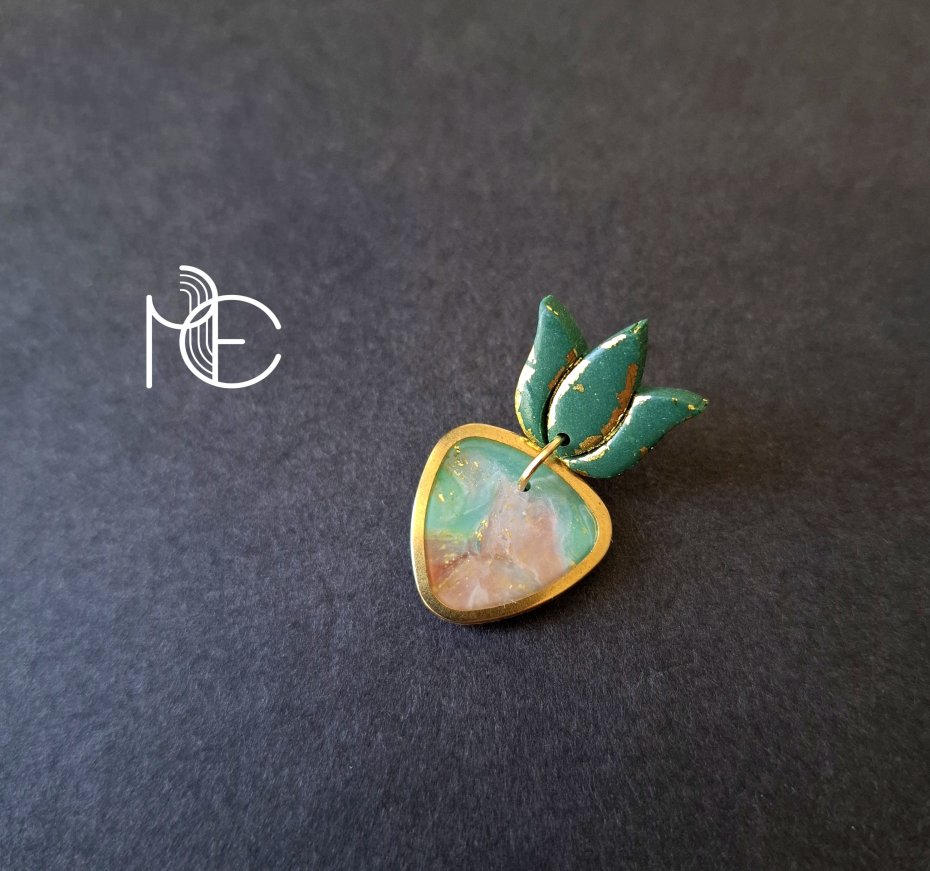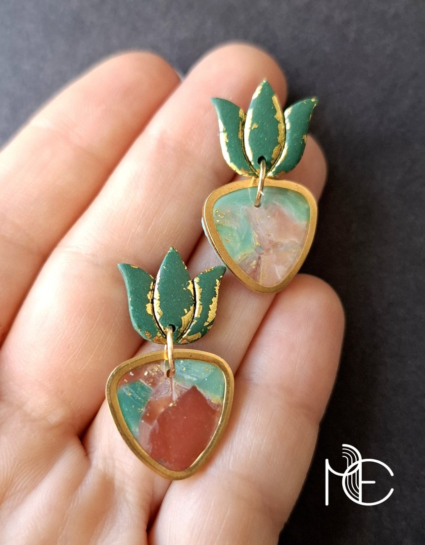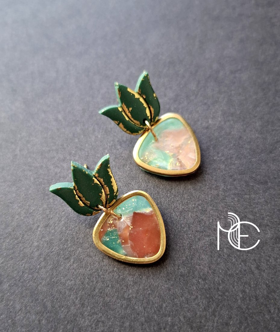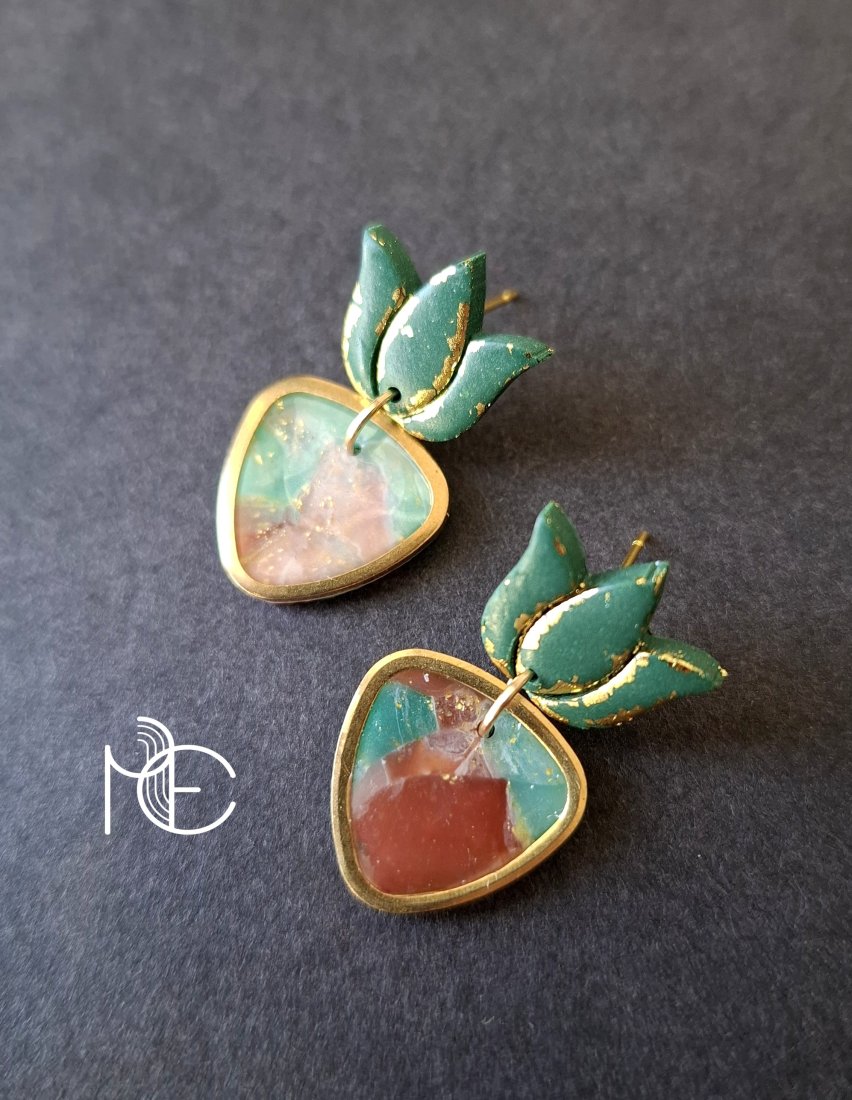 Kolczyki na sztyfty wykonane z wysokiej jakości glinki polimerowej z efektem półprzezroczystości i dodatkiem ozdobnych elementów metalowych. Jednostronne z pozłacanymi, nieuczulającymi sztyftami. Wymiary: 3,1 x 1,8 cm. Wykonane w jedynym egzemplarzu.