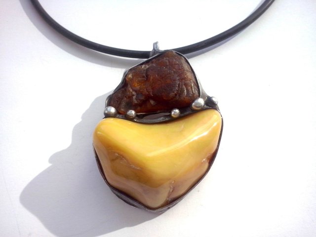 Wisiorek wykonany techniką witrażową z miedzi, cyny, agatu i surowego bursztynu. Zawieszony na czarnej lince kauczukowej o długości ok. 45 cm. Wymiary ok. 5 na 3,5 cm.