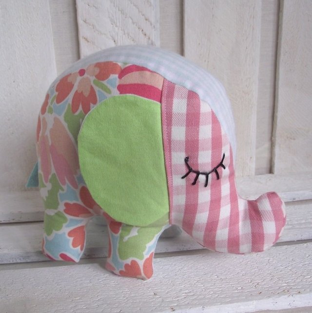 Słonik uszyty z tkaniny bawełnianej. Nie zawiera wełny. Wypełniony specjalnym tworzywem. Układ wzoru na tkaninie może się różnić od tego na zdjęciu. Wysokość 15 cm. Długość 20 cm.