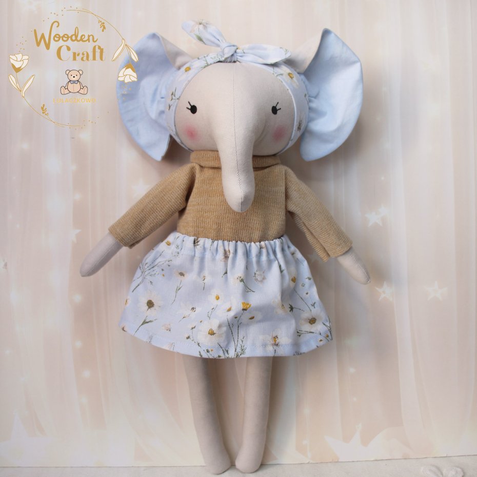 Przeurocza przytulanka słonik, a właściwie słoniczka w kolorze szarym, uszyta ręcznie z najwyższą starannością, ubrana w uroczy beżowy sweterek oraz błękitną spódniczkę z motywem stokrotek, z błękitną opaską na głowie. Wykonana ze 100% bawełny, wypełniona antyalergiczną kulką silikonową. Oczka malowane wodoodpornym markerem. Górne i dolne łapki układają się luźno, słoniczka siedzi z podparciem. Zarówno sweterek jak i spódniczkę można swobodnie zdejmować, w pasie jest wciągnięta gumeczka.