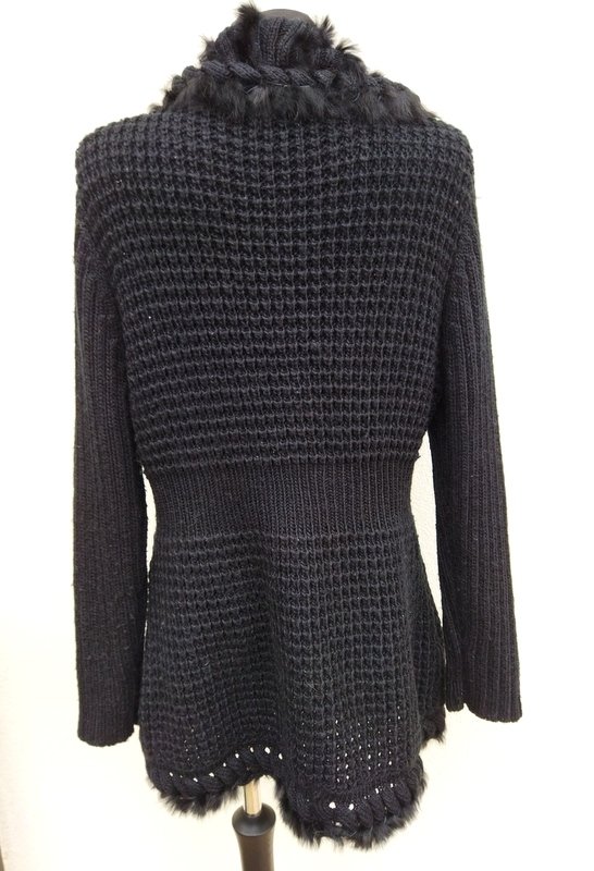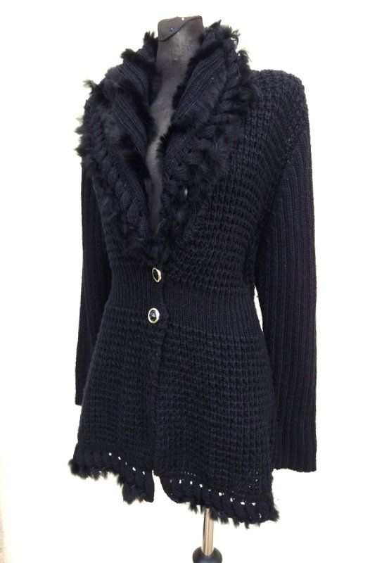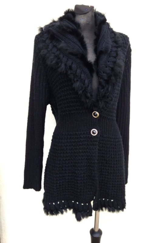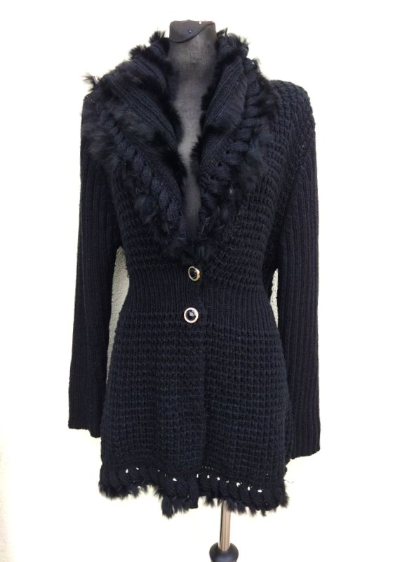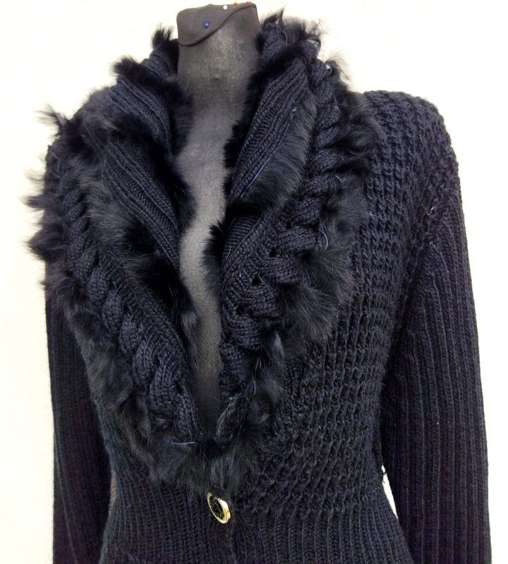 Ciekawy sweter z żeberkowa fakturą z czarnej akrylowo-wełnianej włóczki z szalowym kołnierzem przetykanym króliczym futerkiem, tym samym futerkiem zdobiony dół swetra. Talia podkreślona ściągaczowym wzorem. zapinany w pasie na dwa biżuteryjne guziki.
