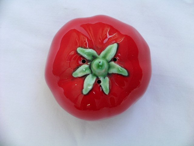 Zabawna solniczka z masy porcelanowej. Szlachetnie wykonana, ręcznie malowana, na błyszcząco szkliwiona. Apetyczna tak, że aż świeci - w oszałamiającej czerwieni :) Od spodu plastikowa zatyczka. 6,5 x 6,5 cm. Stan zachowania bardzo dobry.