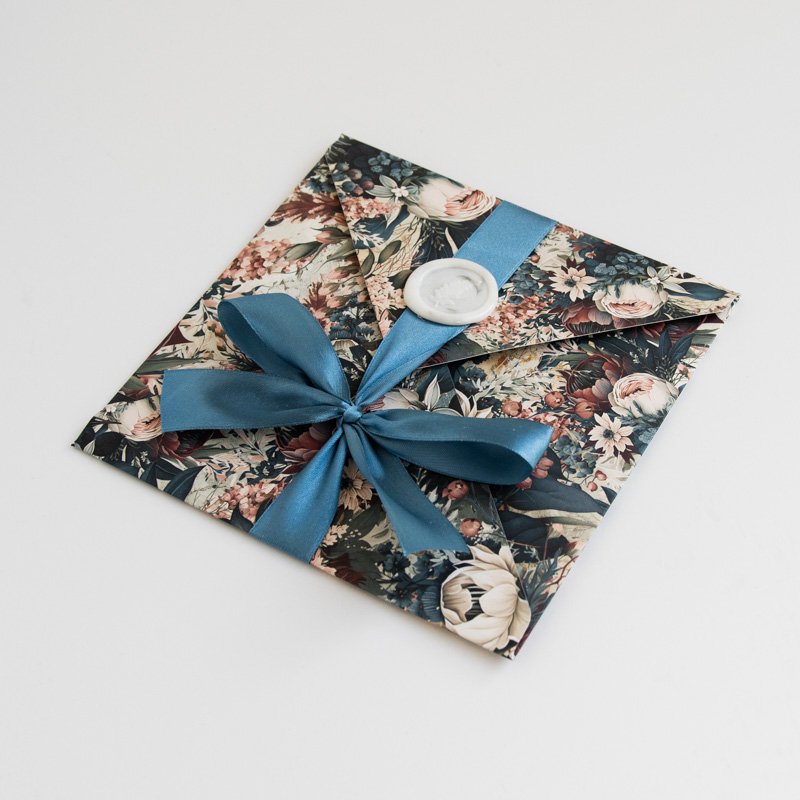 Ręcznie robiona koperta, przewiązana tasiemką, po rozwiązaniu kokardy otwiera się tworząc dużą kartę z miejscem na pieniądze (ozdobna kieszonka na lewym skrzydełku kartki pozwala na wsunięcie poskładanych banknotów).
