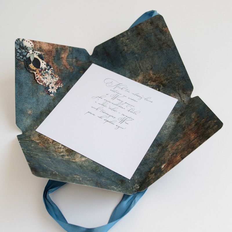 Kartka może się minimalnie różnić od tej na zdjęciu ze względu na ręczne wykonanie (np. rozłożeniem wzoru na powierzchni kartki czy kształtem białej pieczęci na wstążce).