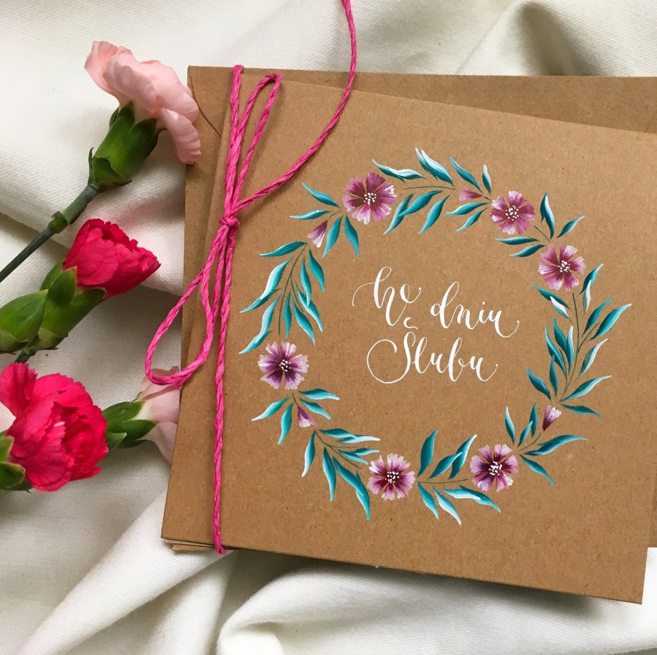 ślubna, na papierze kraft, malowane kwiaty, kaligrafowana, oryginalna
