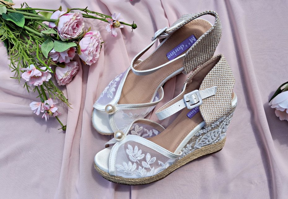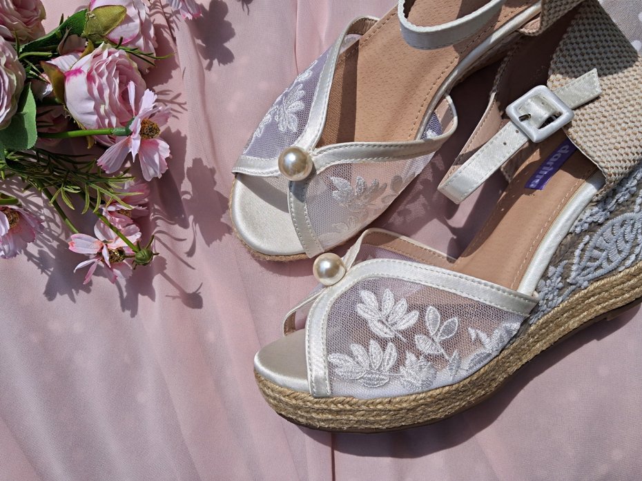 Te ślubne buty na koturnie z kwiatowym przodem ozdobionym perłą będą idealnym dodatkiem na romantyczny ślub w stylu boho.