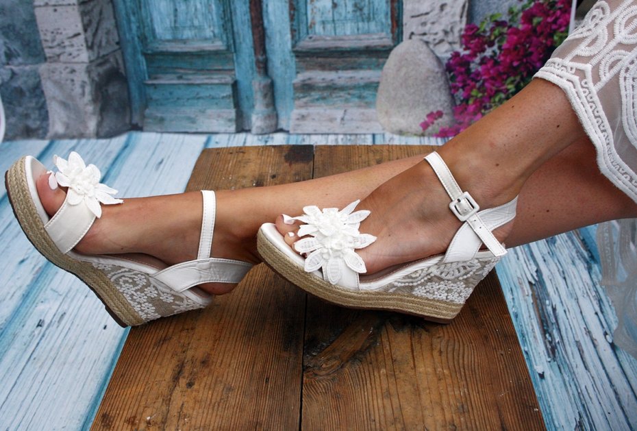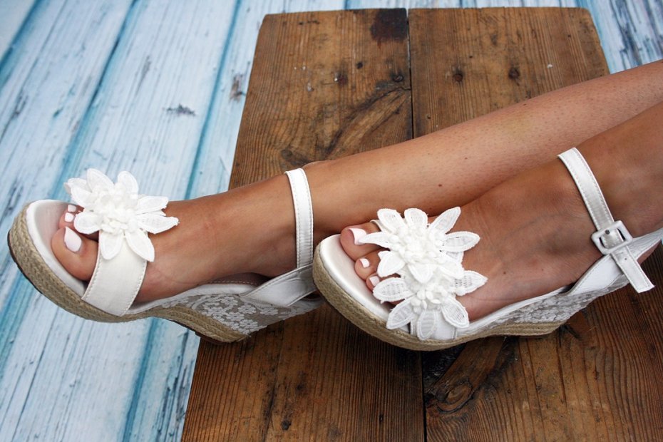 Te buty ślubne na koturnie, ozdobione gipiurowymi koronkowymi kwiatami są idealnym dodatkiem do romantycznego ślubu w stylu Boho.