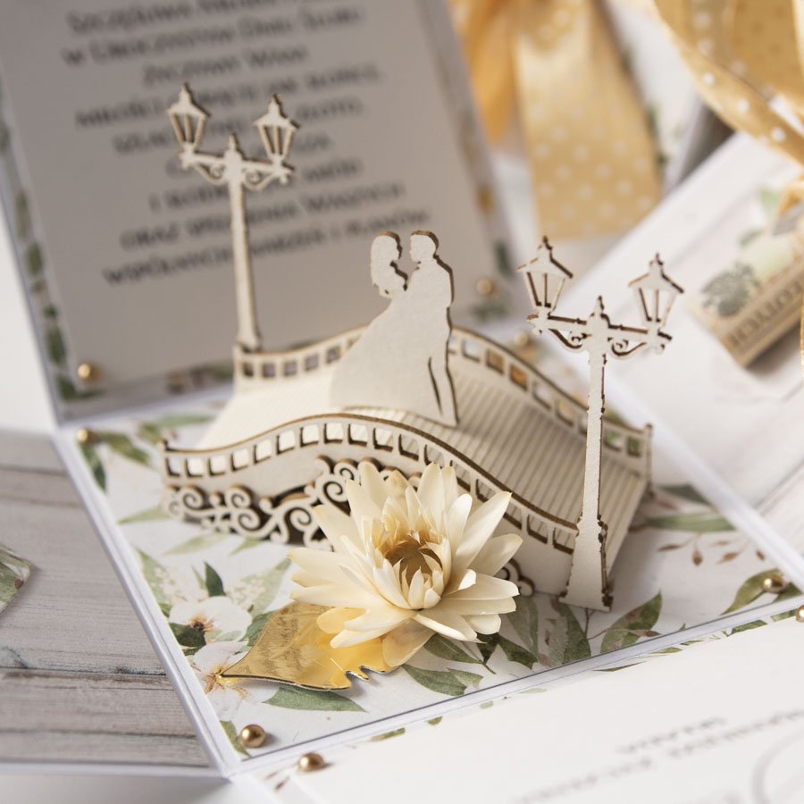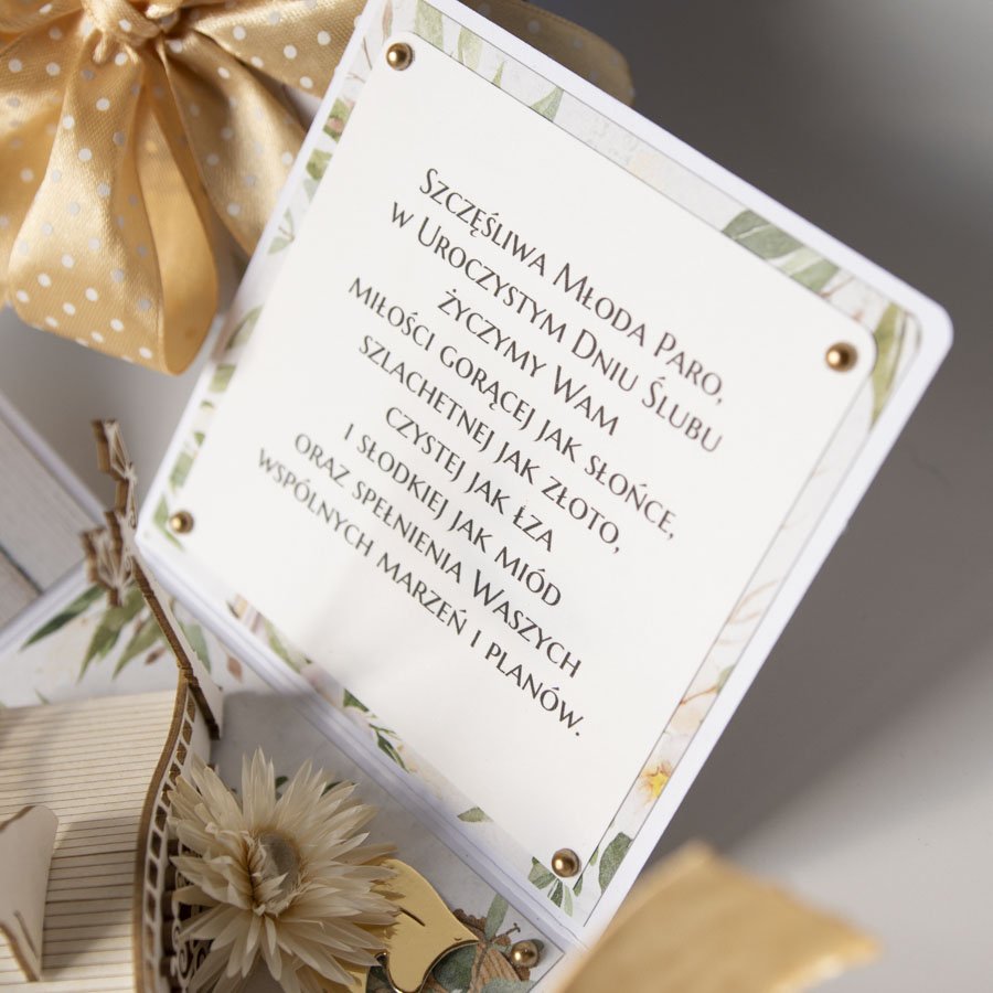 Ręcznie robiona kartka z okazji ślubu w formie rozkładanego pudełeczka.