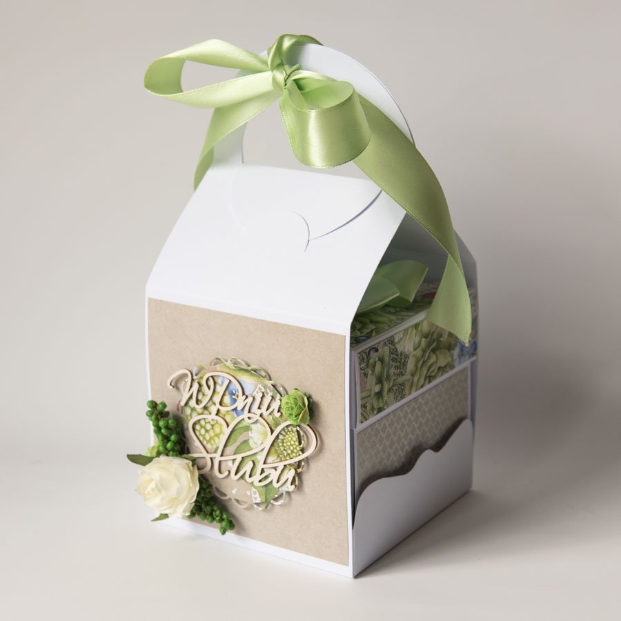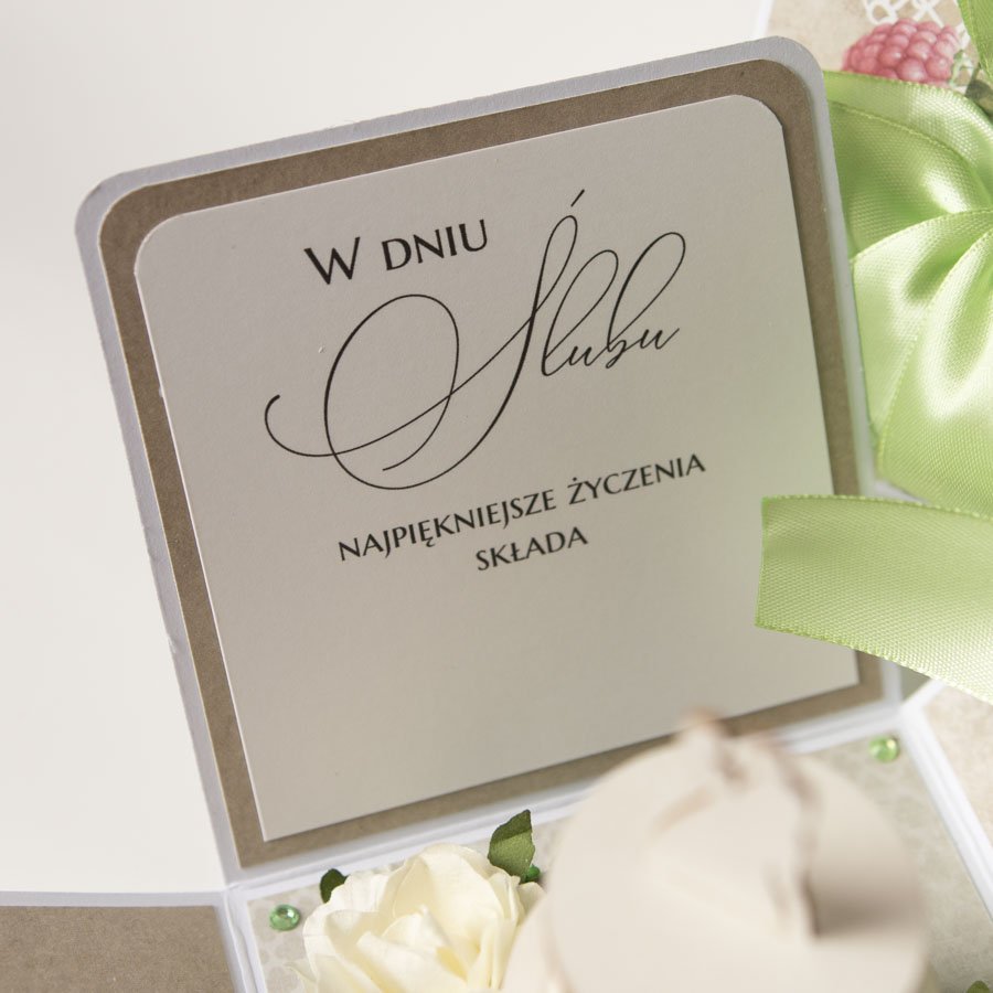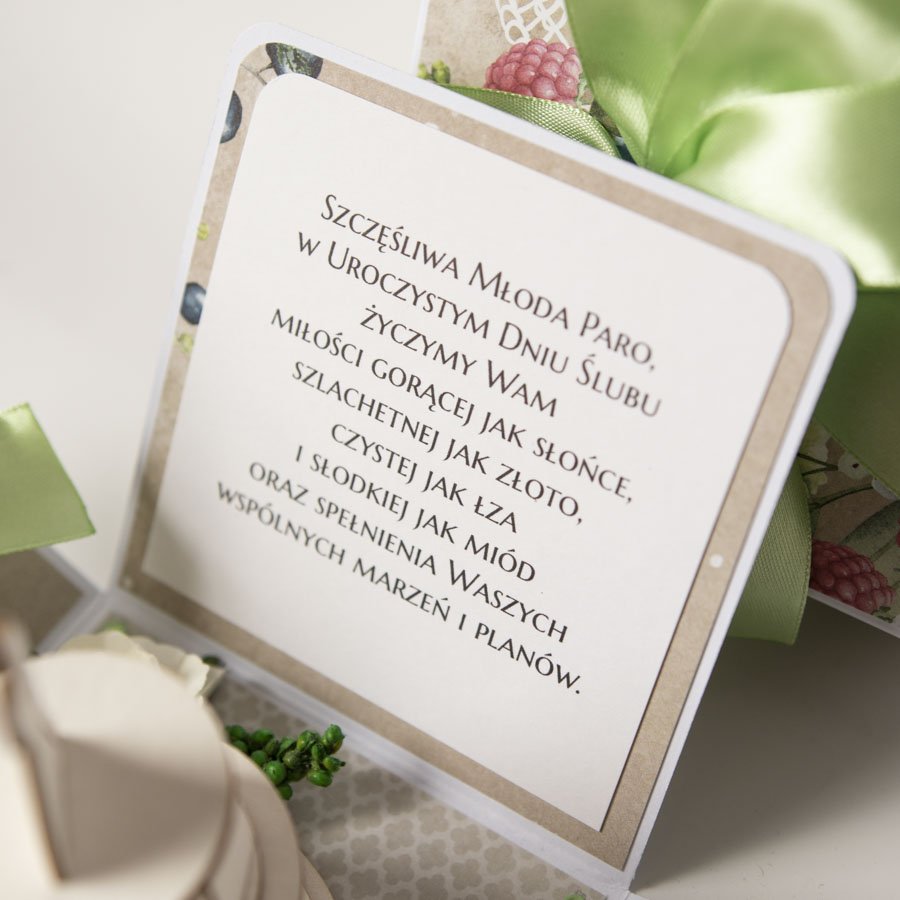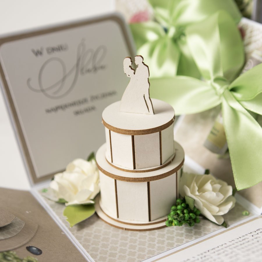 Na środku pudełeczka znajduje się dekoracja - miniaturowy tort z papierowymi kwiatami, na ściankach motyw serca, życzenia dla Nowożeńców, miejsce na podpis oraz miejsce na pieniądze lub kupony lotto (zwija się je w rulonik i przewiązuje kokardą).