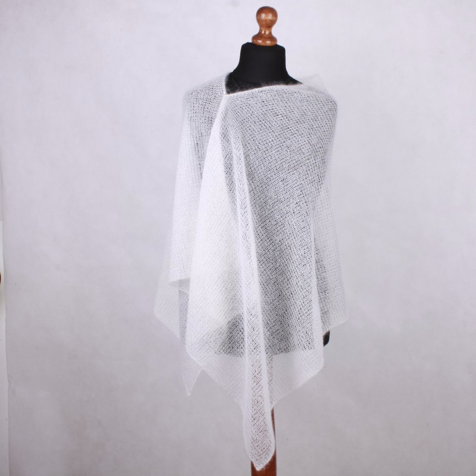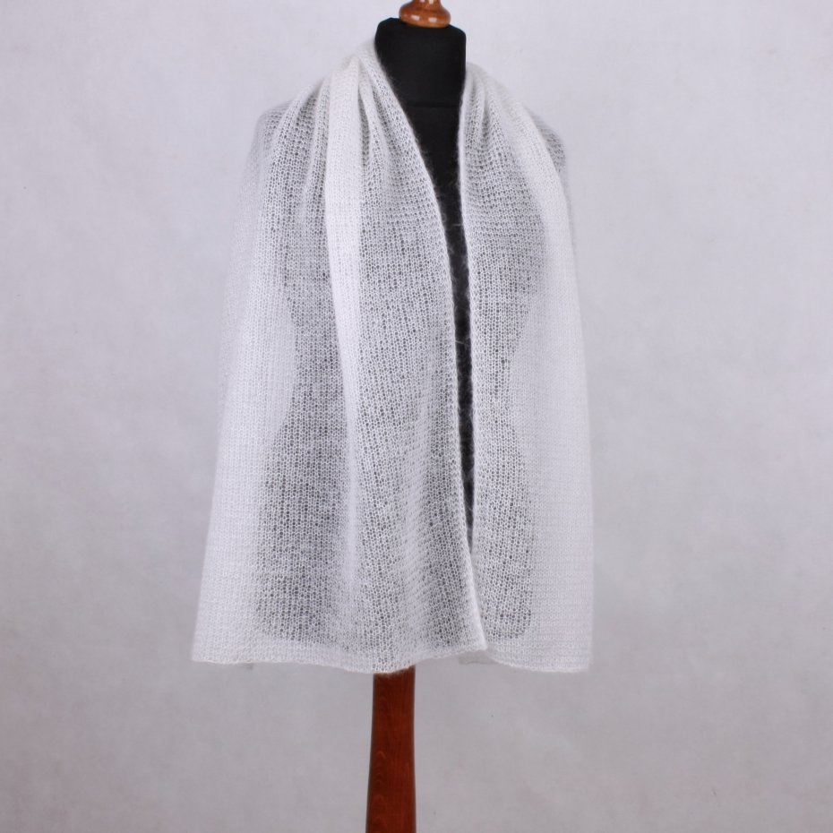 Szal wykonany ręcznie na drutach z mieszanki moheru i jedwabiu. Ta mieszanka sprawia, że szal jest bardzo miękki, delikatny i miły. Nitka wzbogacona jest moherkiem o krótkim włosku, to nadaje dzianinie lekkiej puszystości. Szal bardzo pięknie układa się na sylwetce i pasuje do pasuje do wielu stylizacji. Kolor ecru lekko rozbielony. Wydziergana forma jest maksymalnie prosta. Wzór szala jest lekko sprężynujący. Wymiary szala 66cm x 162cm. Zaleca się pranie ręczne.