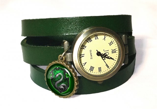 Zegarek ze skórzanym paskiem kilkakrotnie zakręcanym na ręku z ręcznie robioną zawieszką (kaboszonem).
