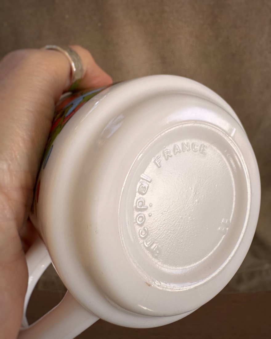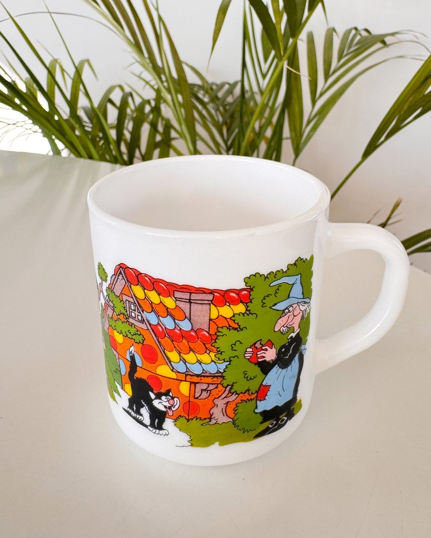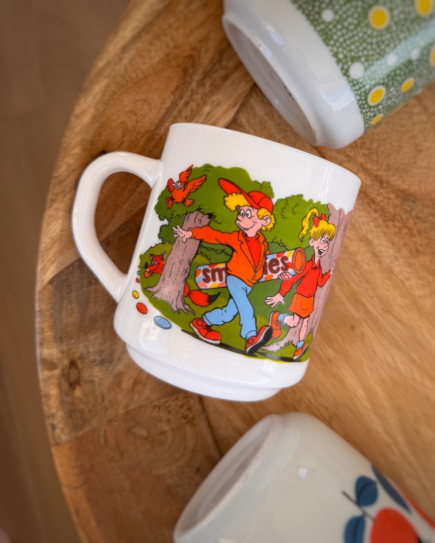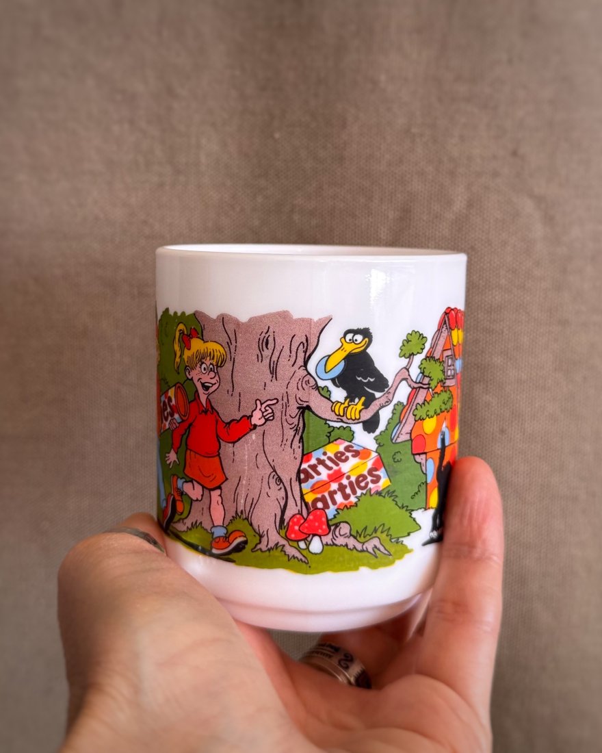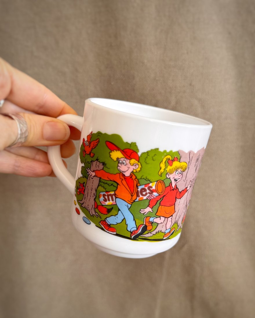 Kubek ze szkła mlecznego Arcopol z dekoracją reklamą Smarties.