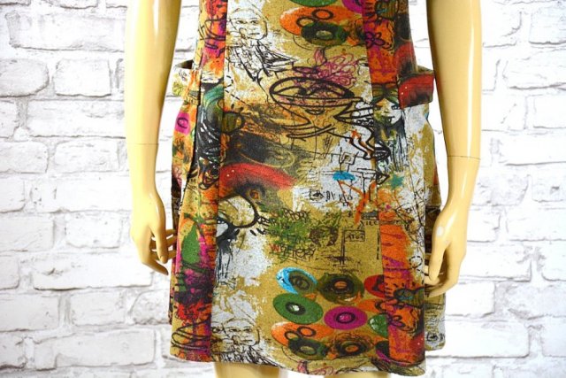 Kolorowa dzianinowa sukienka marki Smashed Lemon w nadruki w stylu grafiiti oraz printy twarzy, fason delikatnie poszerzamy do dołu, na wysokości bioder głębsze kieszonki, pod szyją subtelny golfik/ lub wyższa stójka.Wykonana z bardzo przyjemnej w walorach dotykowych dzianiny.