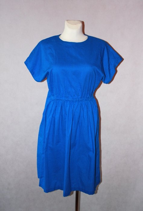 urocza letnia niebieska sukienka vintage w drobne białe kropeczki (kolor ciemniejszy niż na zdjęciach), krótki, szeroki rękawek, w pasie gumka, zapinana z tyłu na guzik, brak metki ze składem i rozmiarem