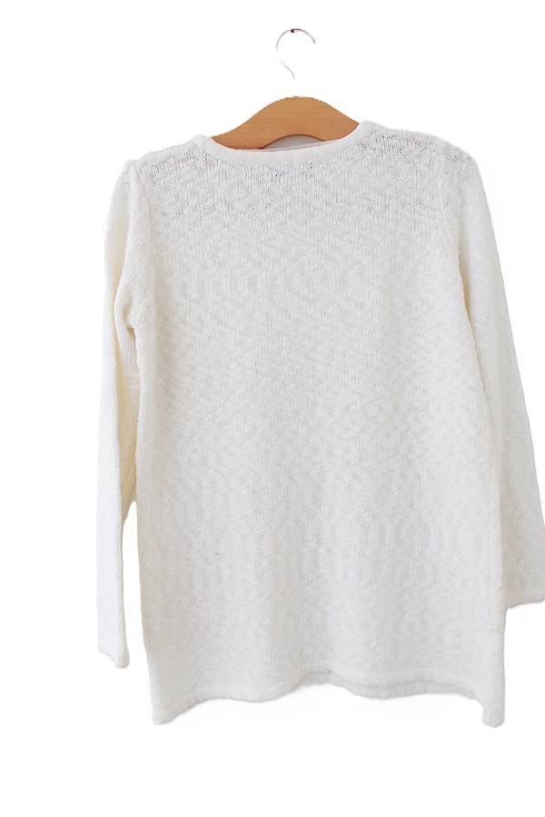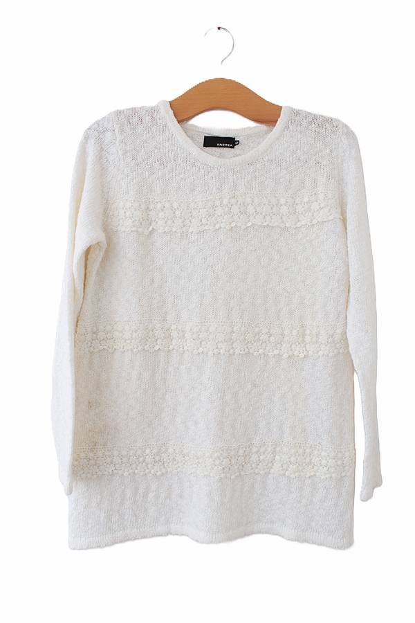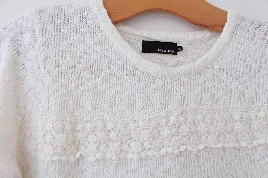 Śmietankowa bluzka dzianinowa vintage z koronką. Ten lekki sweter jest bardzo kobiecy, elegancki, a przy tym wygodny.