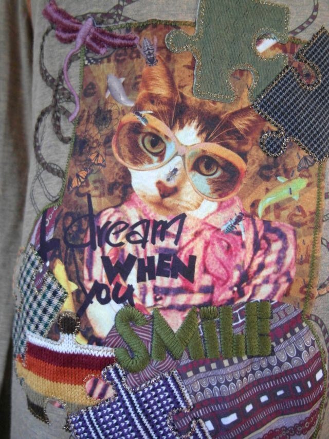 Kolor ciemny melanżowy beż a na nim różne łatki w kratki,puzzle i pan kot.Przy dekolcie guziczki.Mankiety ściągane gumeczkami.