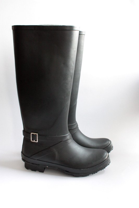 Czarne kalosze o smukłym, sztywnym fasonie przypominającym kozaki. Nie pochodzą z second handu. Podszewka z wyściółką. Będą pasować na osobę o szczupłych łydkach.