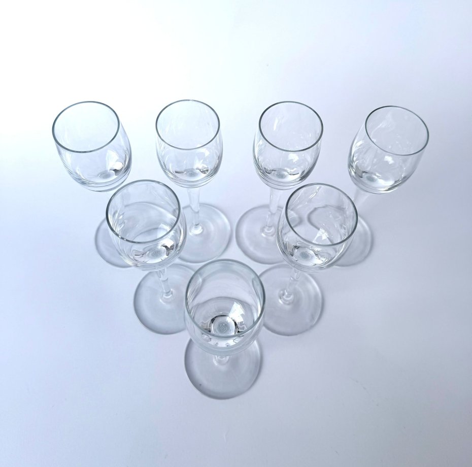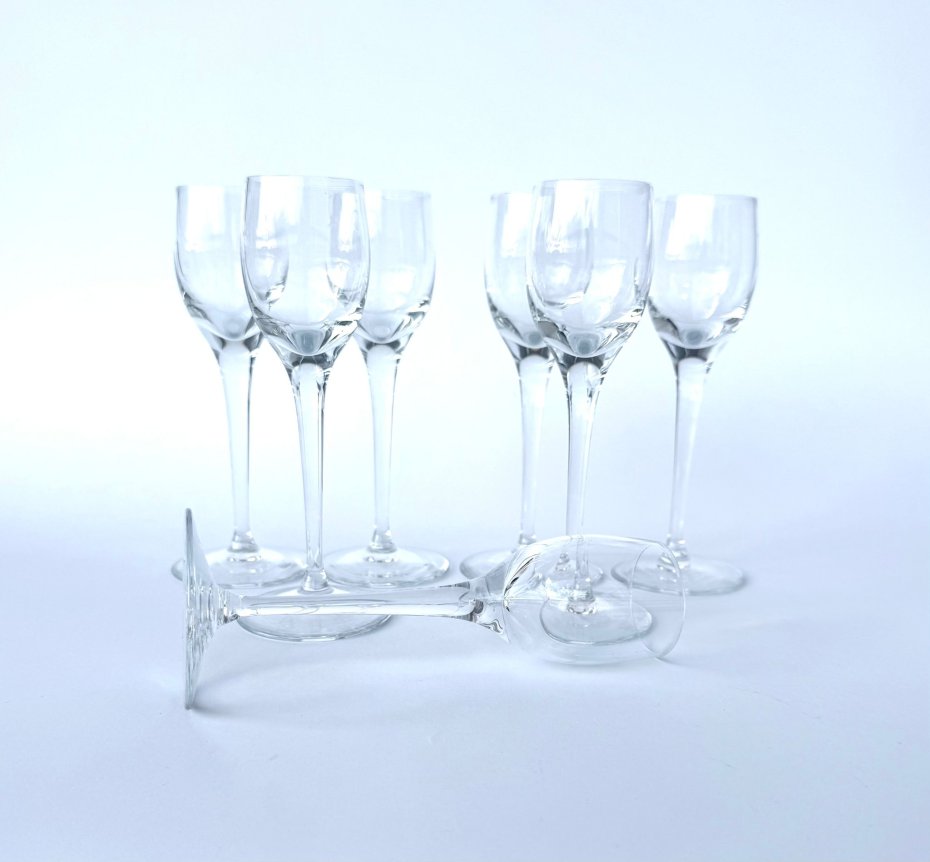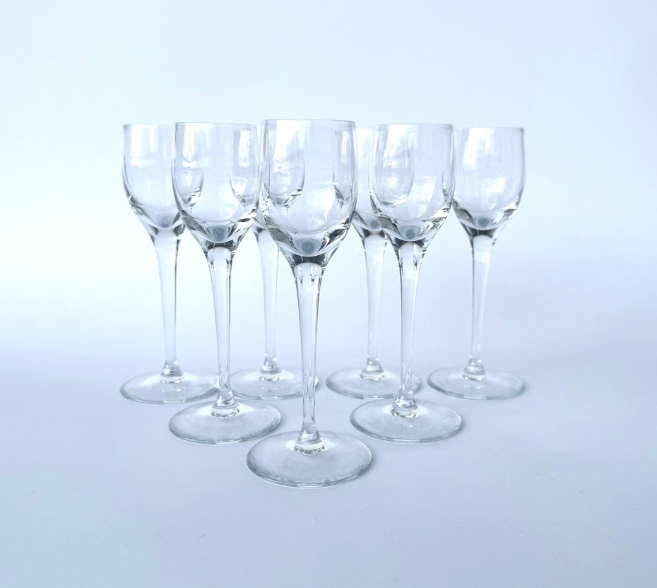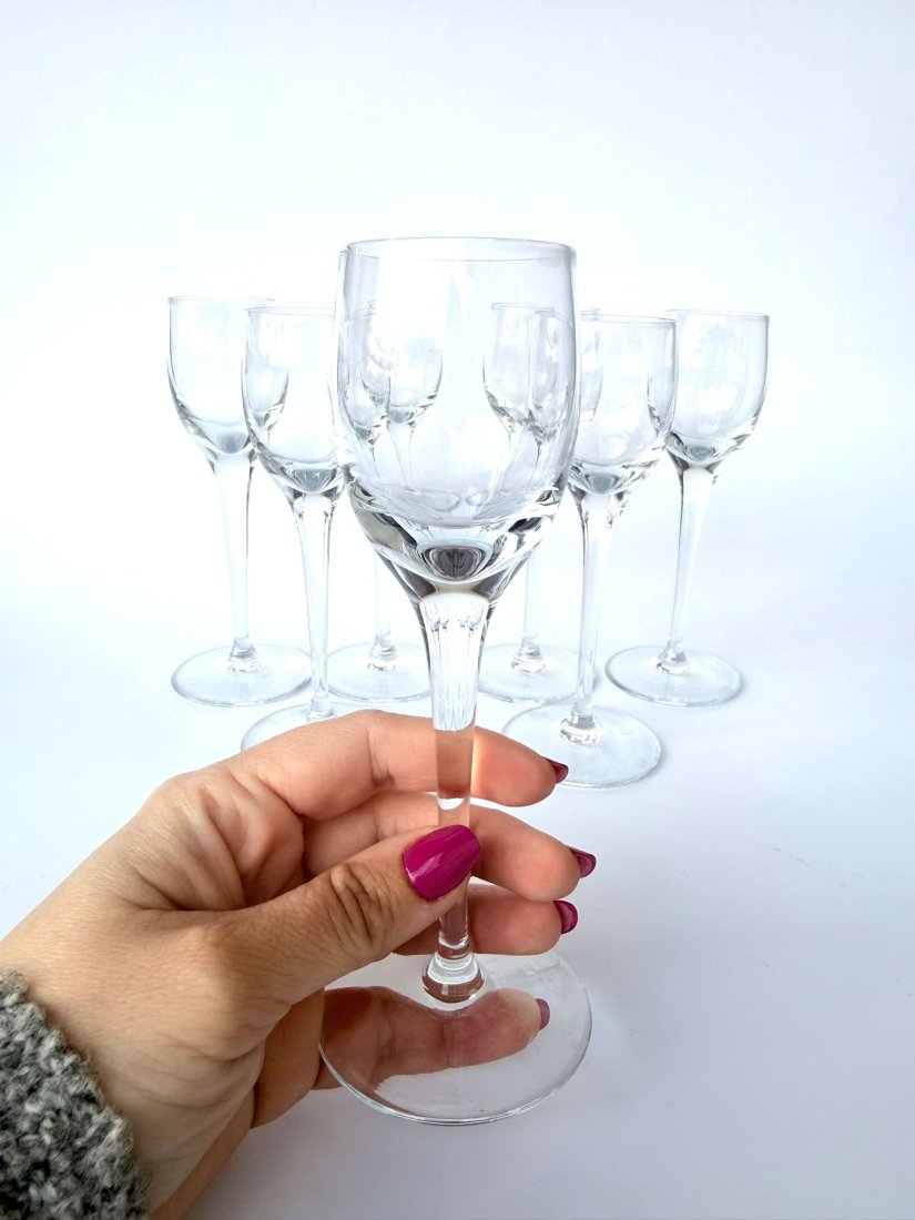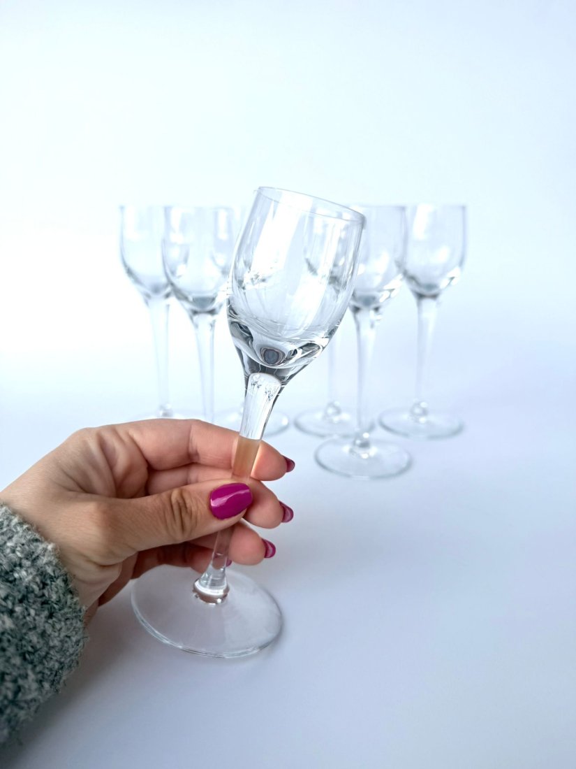 Elegancki zestaw 7 kieliszków do nalewek i likierów, pochodzący z okresu PRL (lata 70./80.). To klasyka wzornictwa tamtych lat – połączenie minimalistycznej czarki z niezwykle smukłą, wysoką nóżką, która nadaje naczyniom wyjątkowej lekkości i elegancji.