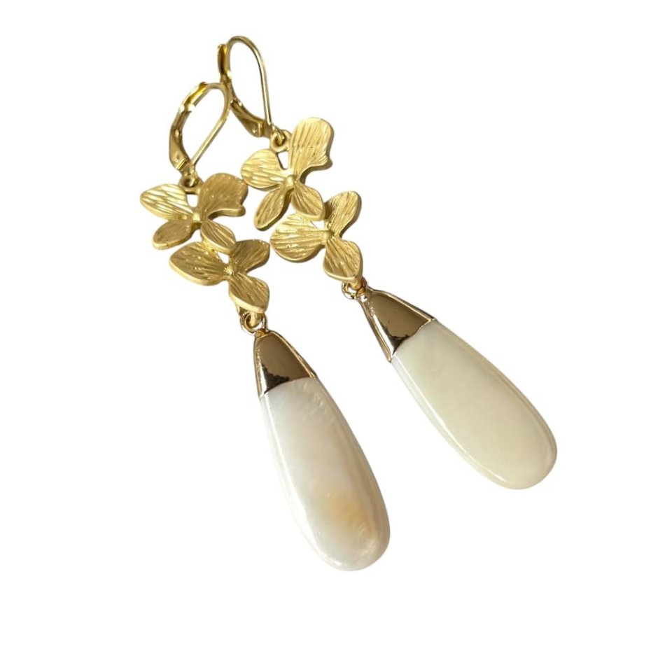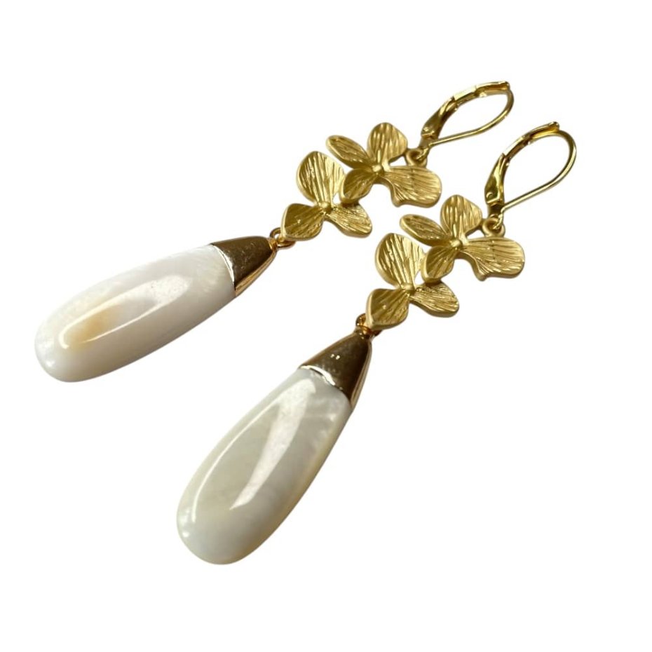 Materiał: stal chirurgiczna pozłacana, masa perłowa w okuciu, kwiatek – metal w kolorze satynowego złota