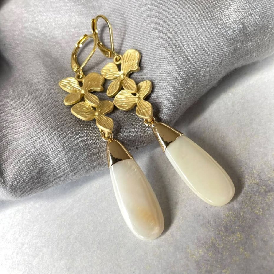 Tagi: #biało złote kolczyki, #długie kolczyki, #kolczyki z perłami, #ślubne z motywem kwiatowym