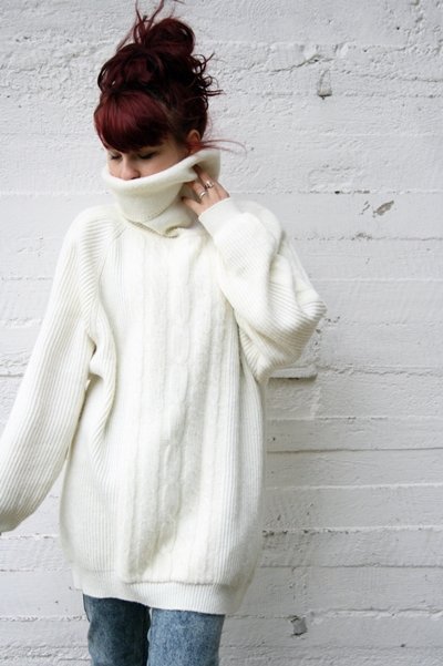 Śnieżnobiały duży sweter z golfem, na zdjęciu osoba rozm s , 158 cm wzrostu.