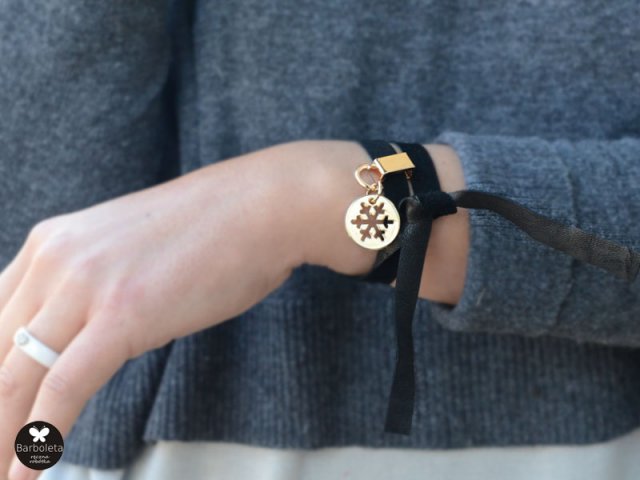 Bransoletka typu zamotka wykonana z wysokiej jakości skóry naturalnej mięciutkiej,zamszowej czarnej. Ozdobiona przywieszką metalową- śniezynką w kolorze złota Bez zapięcia do zamotania i zawiązania. Preferowany węzeł prosty. długość ok 55 cm szerokość 1 cm dostępna również w innej kolorystyce Lekka i wygodna. Ładnie układa się na nadgarstku. Opatrzona metką projektanta. W zależności od ustawień monitora, kolory w rzeczywistości, mogą nieznacznie różnić się od przedstawionych na zdjęciu. © wzór chroniony prawem autorskim