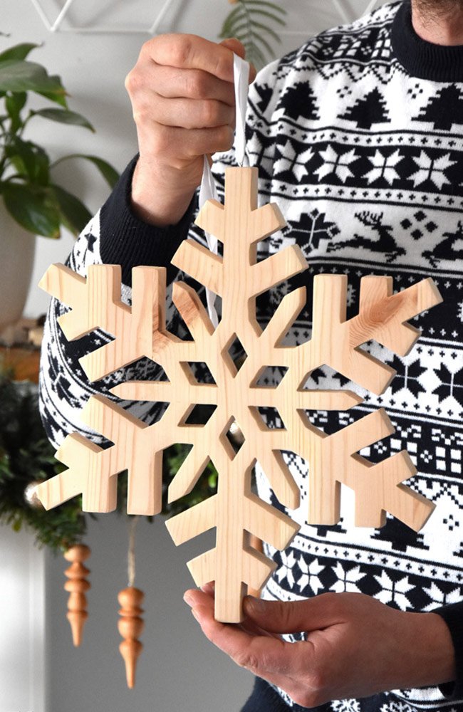 Duża, efektowna śnieżynka wycinana ręcznie z drewna sosnowego.