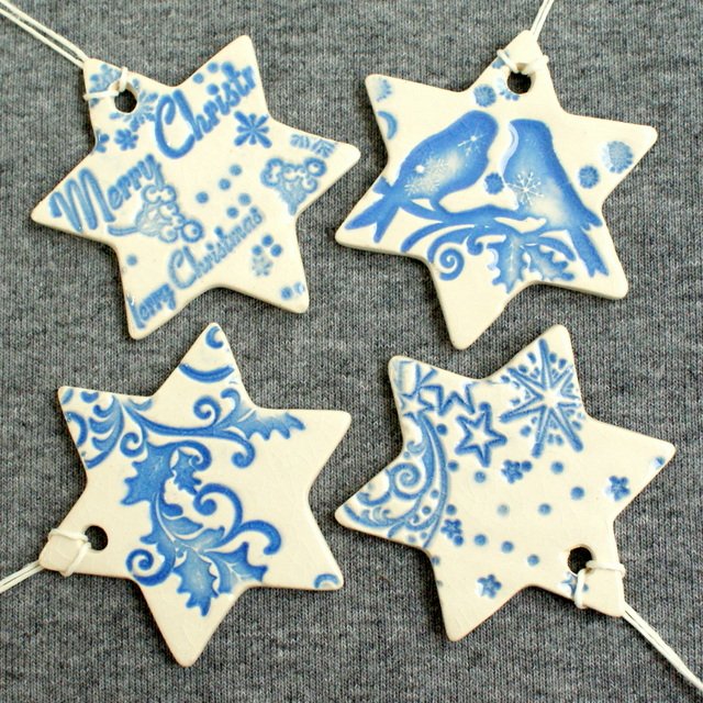 Zestaw 4 ceramicznych gwiazdek - zawieszek. Gwiazdki w kolorze ecru, przyozdobione motywami w kolorze błękitu - błyszczące. Ze względu na ręczne wykonanie, motywy na gwiazdkach mogą nieznacznie różnić się od przedstawionych na zdjęciu. Wymiary gwiazdek - ok. 6 cm. Ozdobnie zapakowane. Polecam