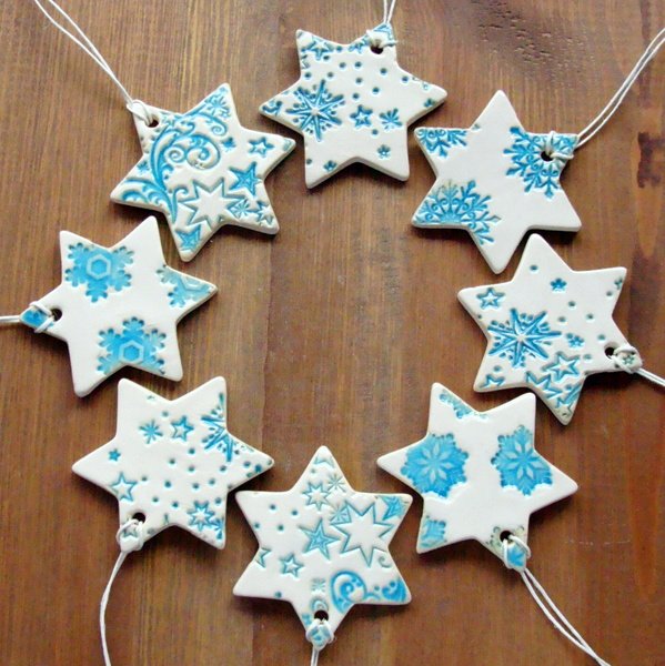 Zestaw 8 zawieszek gwiazdek - ozdób ceramicznych przyozdobionych motywami zimowymi. Pięknie prezentują się na choince lub zimowym stroiku. Pokryte szkliwami w turkusie oraz jasnym ecru. Wymiary: 6 cm. Pięknie zapakowane. Bardzo polecam:)