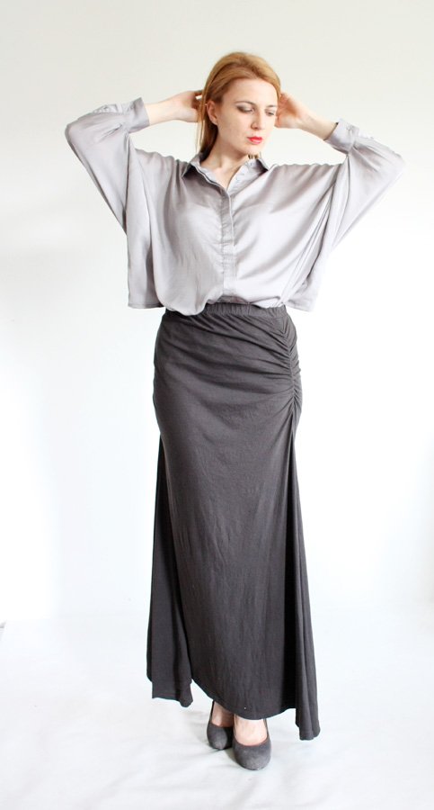 Długa grafitowa spódnica uszyta z bawełny. Skandynawska marka SNOB. Prosta forma przełamana detalami: marszczenia na biodrach przykuwają uwagę, a dłuższe boki optycznie wysmuklają sylwetkę. Ta spódnica będzie praktyczną bazą, z którą połączysz bluzki w różnych kolorach i fasonach.