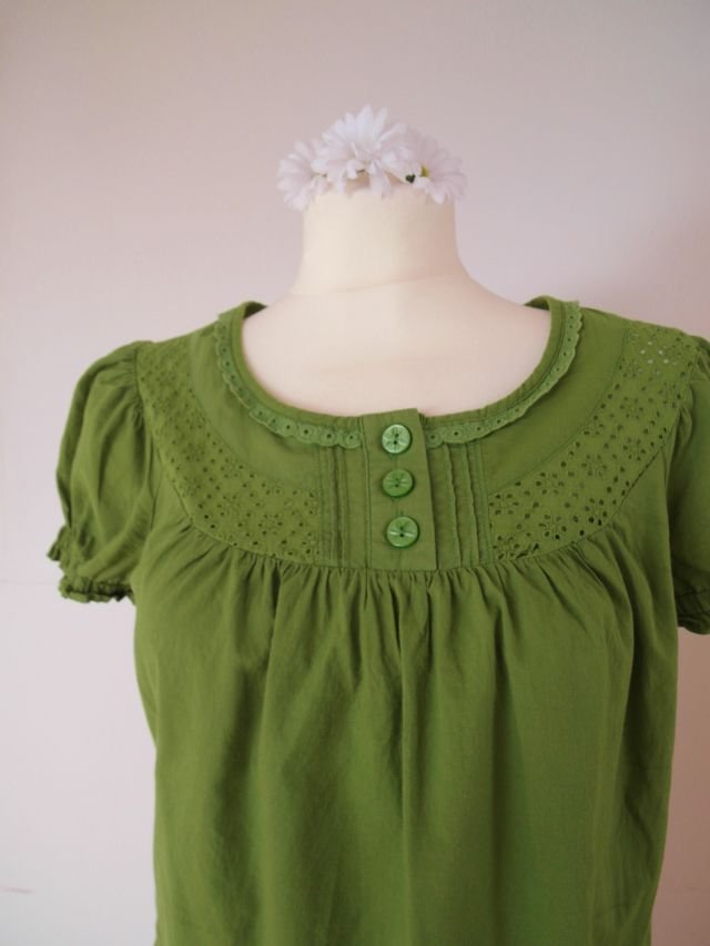 Prosta,luźna z koronkowym karczkiem i w pięknym jasno oliwkowym kolorze.Świetnie pasuje do opalonego ciałka.