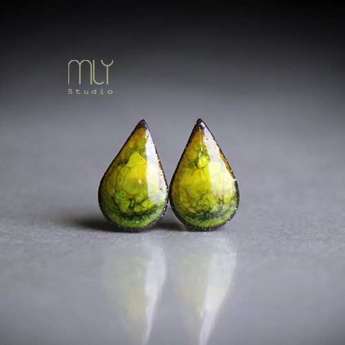 Oryginalne ceramiczne kolczyki w formie sztyftów, ręcznie wykonane z delikatnej gliny kamionkowej, jednostronnie szkliwione zielonym szkliwem z efektem plamek, na antyalergicznych sztyftach w kolorze srebrnym. Długość ok 13mm