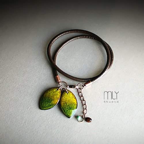 Efektowna bransoletka wykonana z rzemienia jubilerskiego w kolorze brązowym, elementów w kolorze miedzianym i ręcznie wykonanych ceramicznych zawieszek, szkliwionych mieszanką zielonych szkliw z efektem plamek o subtelnym połysku, Obwód regulowany. Polecam