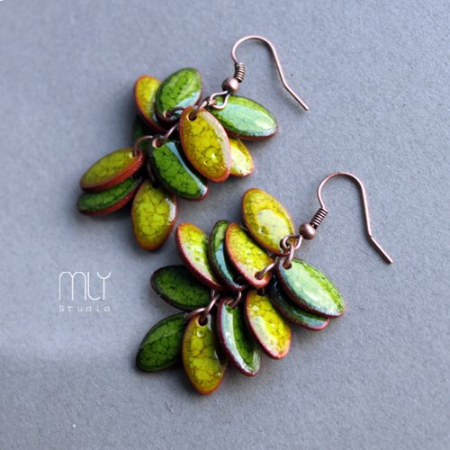 Oryginalne i efektowne ceramiczne kolczyki w formie gronek, ręcznie wykonane z mocno spieczonej gliny kamionkowej, jednostronnie szkliwione błyszczącym zielonym szkliwem z efektem drobnych plamek, na miedzianych biglach. Długość około 5cm. Polecam