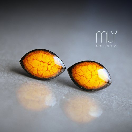 Ceramiczne kolczyki w formie sztyftów, ręcznie wykonane z delikatnej gliny kamionkowej, jednostronnie szkliwione pomarańczowym szkliwem z efektem plamek, na antyalergicznych sztyftach w kolorze srebrnym.Długość ok. 12mm.Polecam . Termin realizacji zamówienia to 1-2 dni