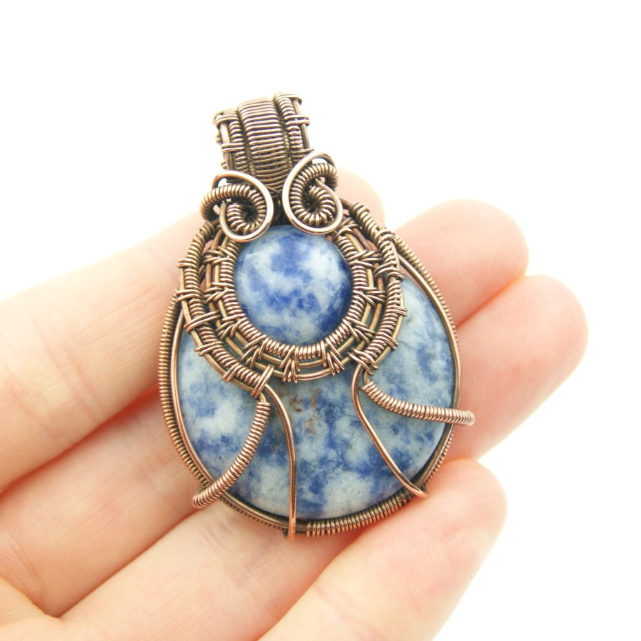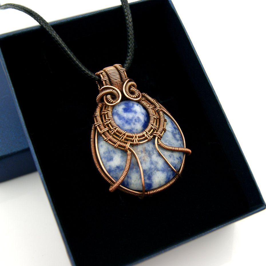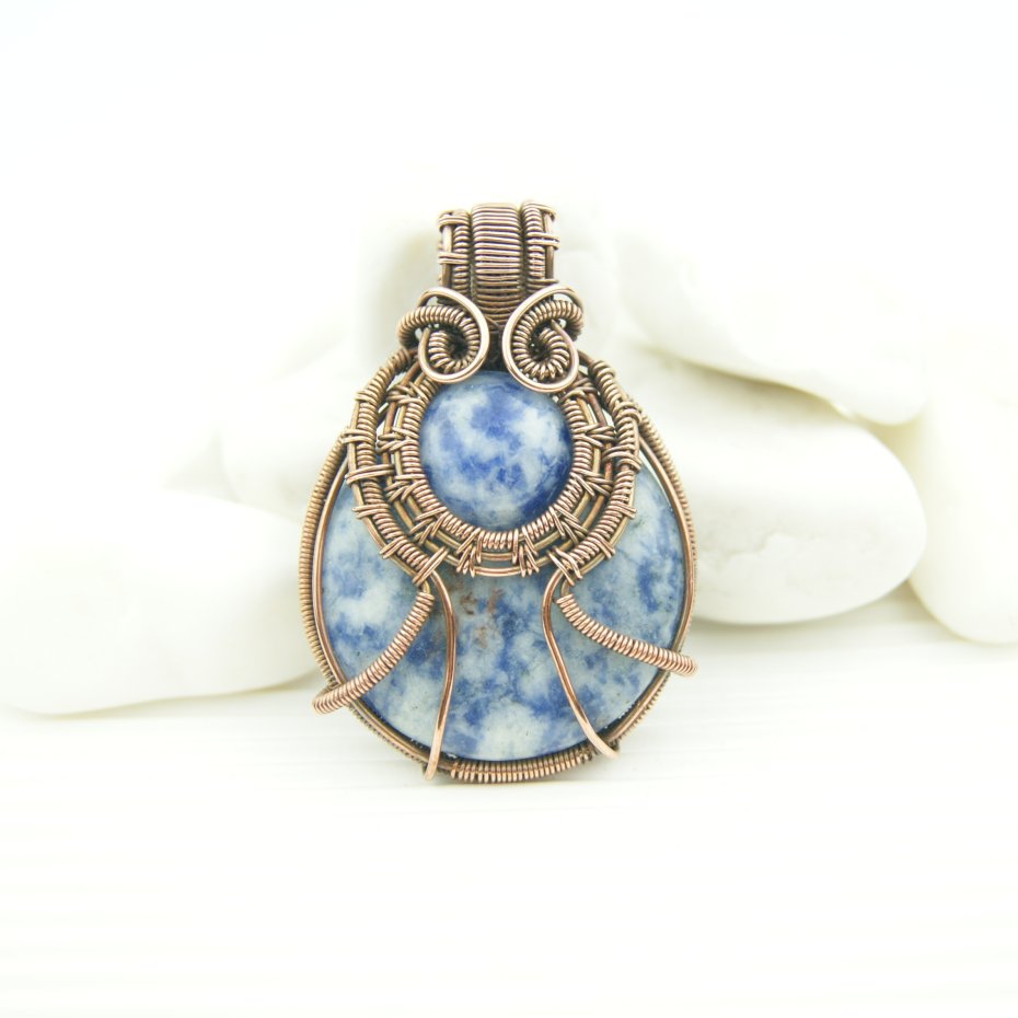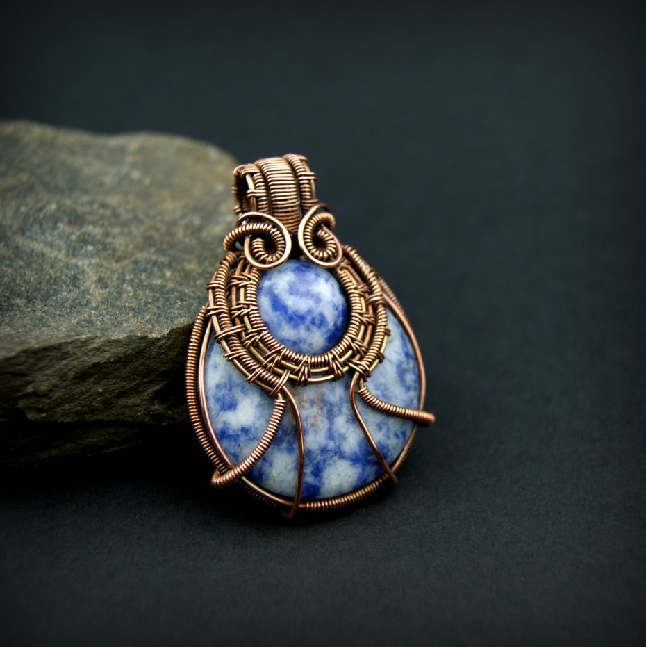 Wisiorek wykonany w pracochłonnej technice wire wrappingu. Wisior powstał na bazie dwóch kamieni sodalitu. Całość misternie opleciono drutem miedzianym.