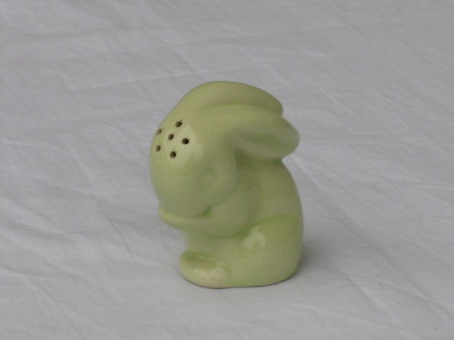 Dawnej daty, uroczy zajączek solniczka. Porcelanowy, na błyszcząco szkliwiony. Od spodu korek naturalny. 5 x 3,5 x 5,5 cm. Stan zachowania bardzo dobry.