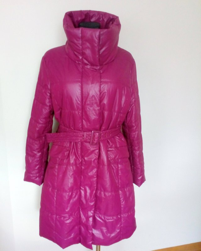 Lekki, pikowany płaszcz wypełniony puchem polyestrowym, kolor - ciemna fuksja, zapinany na zamek i zatrzaski ukryte po listwą, z przodu poziomo wpuszczane kieszenie z patkami