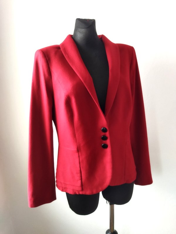 Elegancka , zgrabna marynarka z lżejszej tkaniny wełnianej w kolorze jarzębinowej czerwieni z domieszka poliamidu. Taliowana , z szalowym kołnierzem , odcinana w pasie, z potrójną baskinką. Zapinana na trzy guziki. Całość na podszewce w kolorze tkaniny wierzchniej. Miła i bardzo lekka.