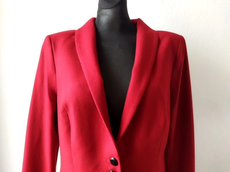 Elegancka , zgrabna marynarka z lżejszej tkaniny wełnianej w kolorze jarzębinowej czerwieni z domieszka poliamidu. Taliowana , z szalowym kołnierzem , odcinana w pasie, z potrójną baskinką. Zapinana na trzy guziki. Całość na podszewce w kolorze tkaniny wierzchniej. Miła i bardzo lekka.