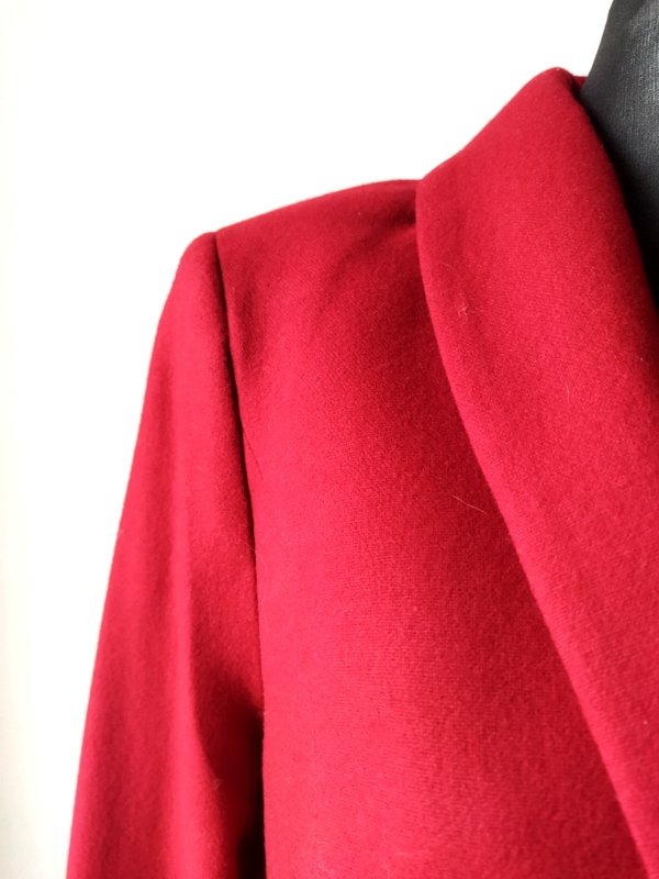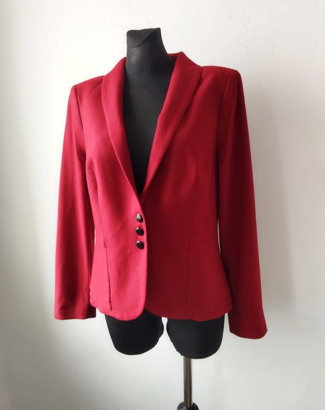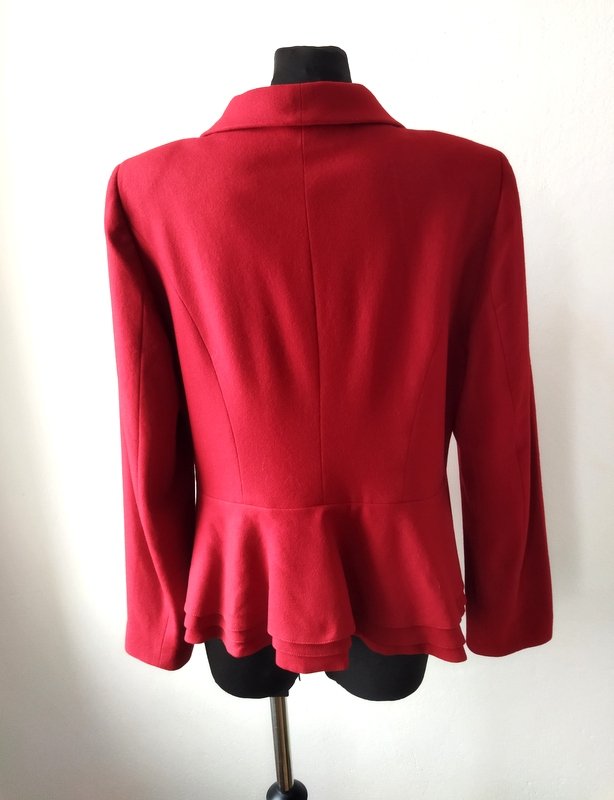 Elegancka , zgrabna marynarka z lżejszej tkaniny wełnianej w kolorze jarzębinowej czerwieni z domieszka poliamidu. Taliowana , z szalowym kołnierzem , odcinana w pasie, z potrójną baskinką. Zapinana na trzy guziki. Całość na podszewce w kolorze tkaniny wierzchniej. Miła i bardzo lekka.