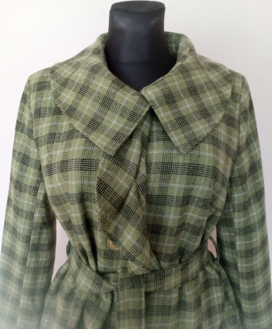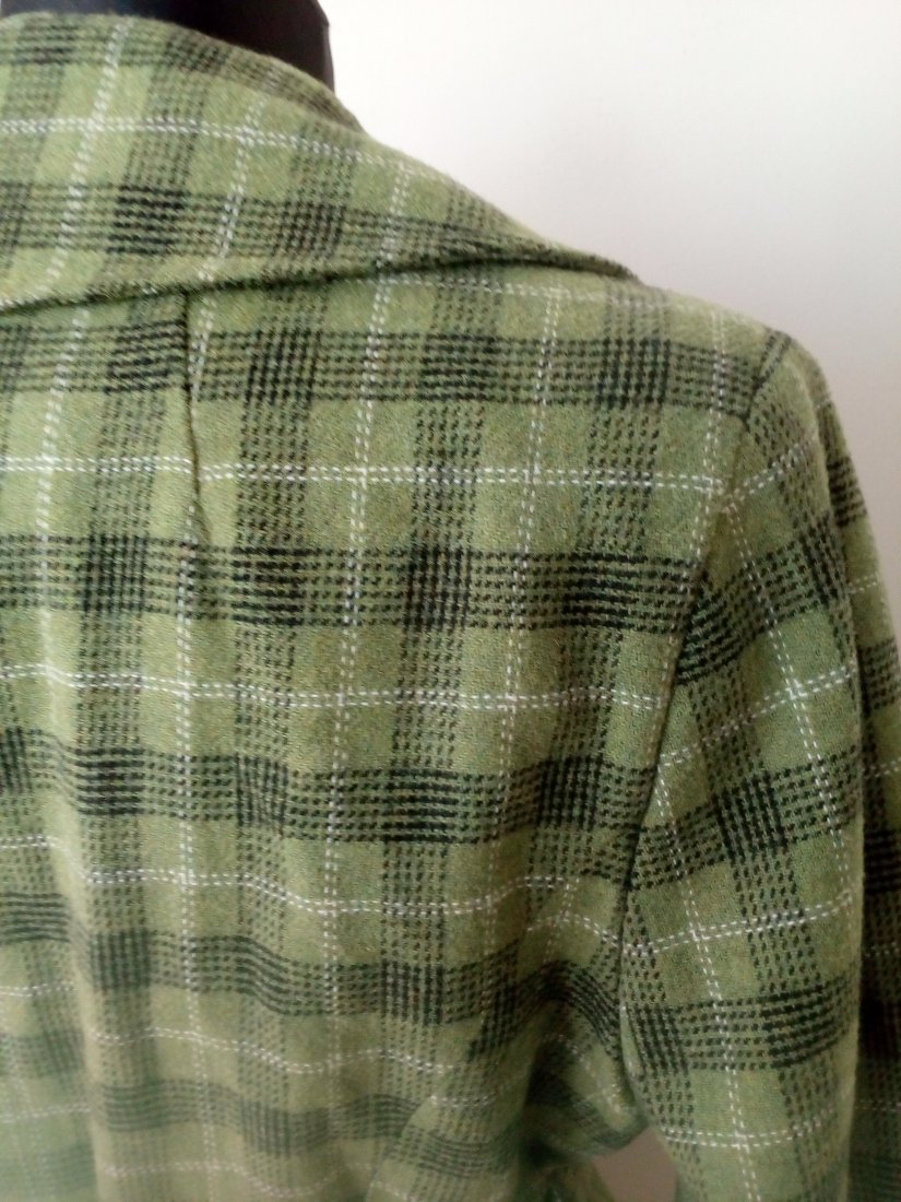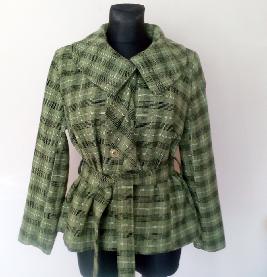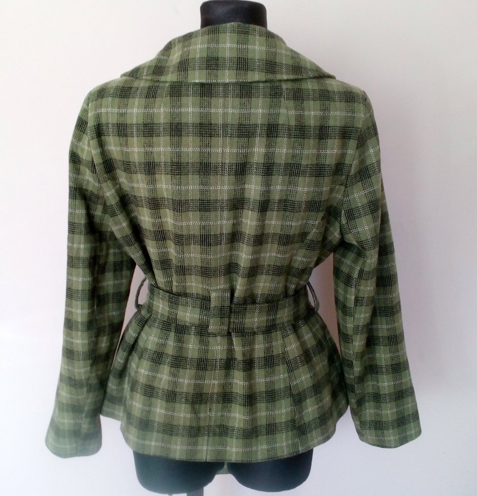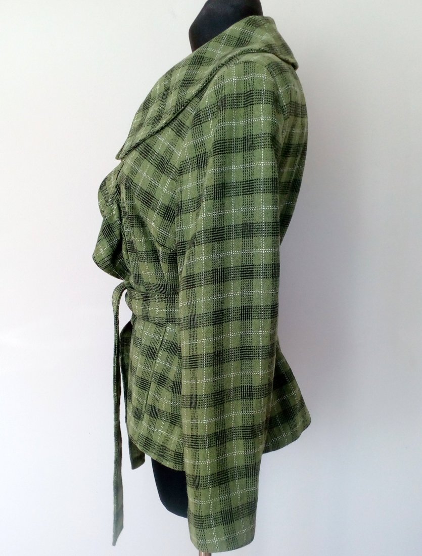 ładny żakiet w kolorze trawiaste zieleni, w czaro- białą kratę, z ozdobnym kołnierzem i falbaną wzdłuż zapięcia, z paskiem, od środka zielona podszewka, na ramionach poduszki