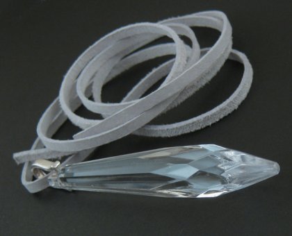 Wisior (dł. 8 cm) wykonany ze szklanego kryształu oraz srebra pr. 925 zawieszony na zamszowym rzemyku o długości 98 cm.