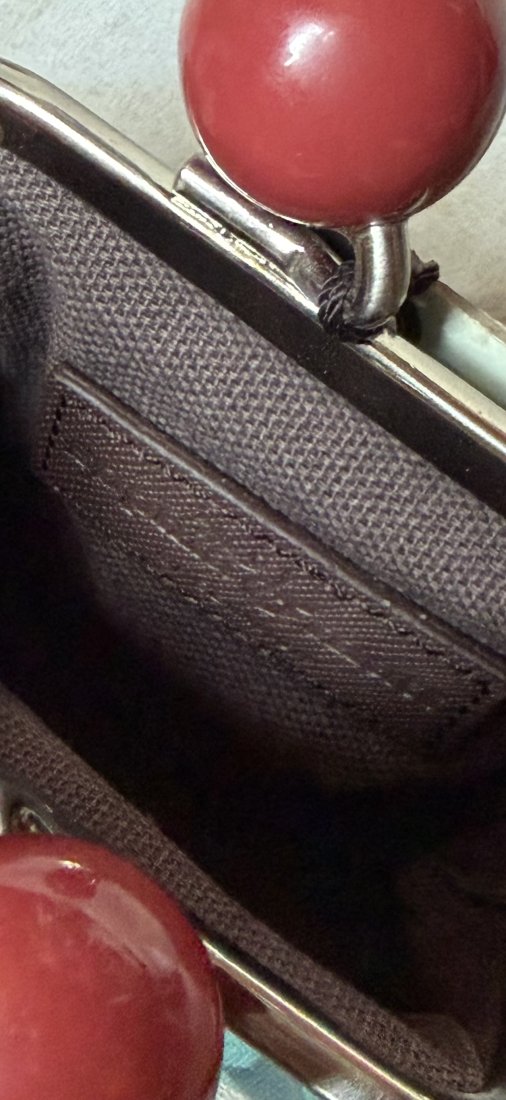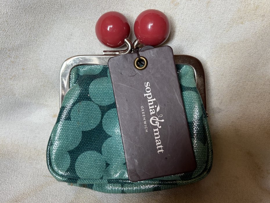 Sophia & Matt - Greenwich : kultowy , niestety już zamknięty na stałe designerski sklep z autorskim asortymentem , zabawnych , geometrycznych akcesoriów i torebek . Portmonetka z metką sklepową , nowa , efektowna , dobrze wykonana . Zabawne duże kulki , nabłyszczana tkanina , logo firmowe wewnątrz portmonetki . Ciekawa i absolutnie niespotykana . Dół 10 x prawie 4 cm wysokość całkowita 12 wysokość bez zamknięcia 9 cm góra 9,5 cm Stan zachowania bardzo dobry - nowa . Nadaje się na oryginalny prezent .