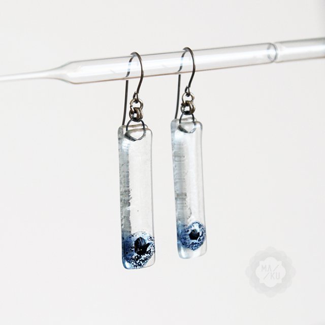 Kolczyki ze szklanymi podłużnymi oczkami wykonanymi metodą fusingu.