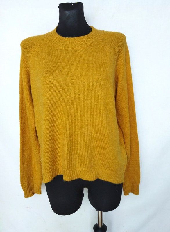 Dobrej jakości sweter z udziałem alpaki, w kolorze miodowej żółci. Luźny fason z raglanowymi rękawami i rozcięciami po bokach na wysokość ściągacza. Miły, podatny i rozciągliwy. Wykończony ściągaczami.