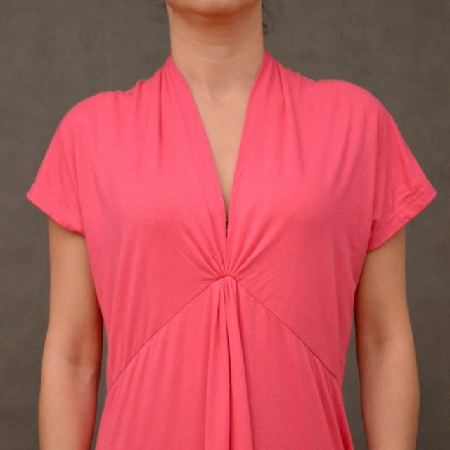 Śliczna fuksjowa sukienka z ciekawym dekoltem.
